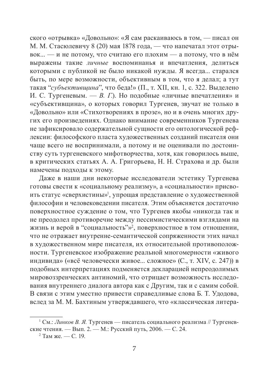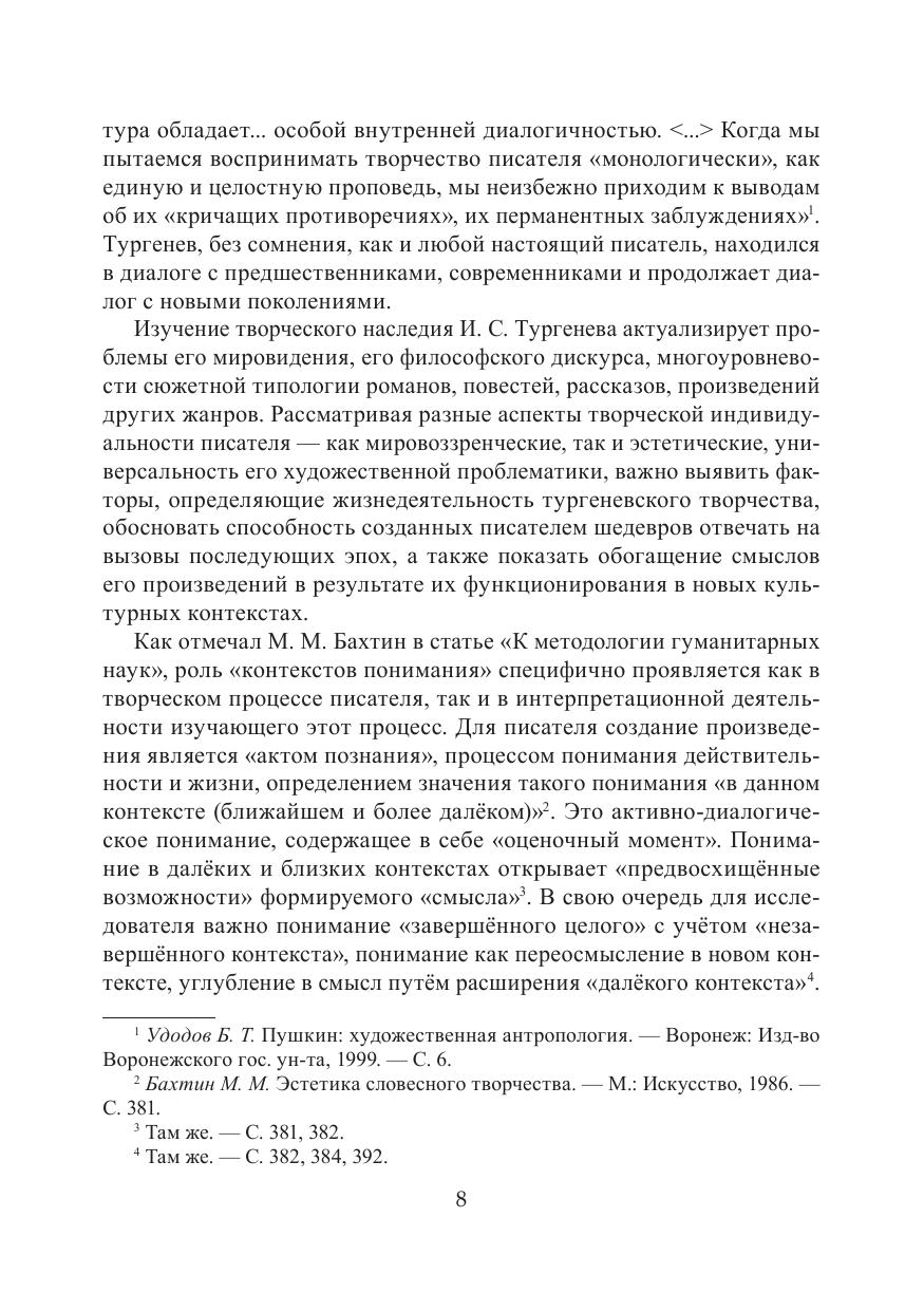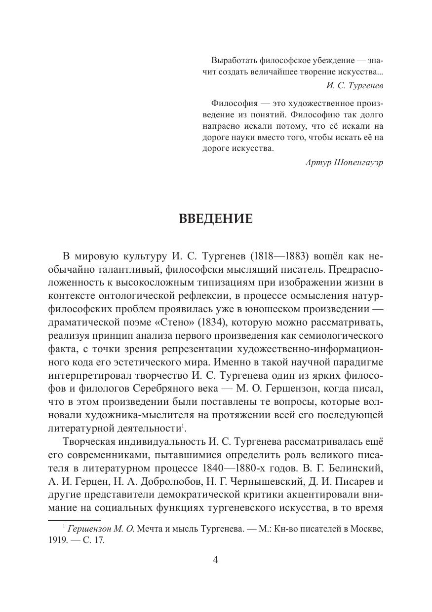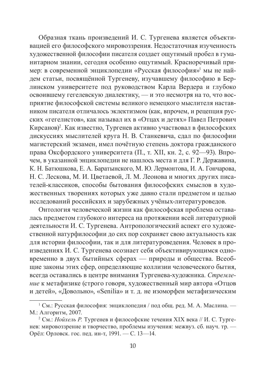 Художественная философия писателя рассматривается на материале как литературных произведений, так и других форм словесно-организованного повествования (эпистолярное наследие, статьи, рецензии, биографические очерки, речи и т. д.). В системе литературоведческого анализа актуализируются методологические принципы и подходы, определяющие современную парадигму философии литературы. Взаимосвязь социально-исторического, философского и универсального (космического, натурфилософского) в мировоззрении и творчестве И. С. Тургенева исследуется при освещении формирования художественных идей в контексте философствования. Проблематика философии литературы в аспекте «философия в литературе» реализуется в практике изучения воззренческих констант эстетического мира писателя-мыслителя, бытийного содержания его произведений, художественной антропологии, онтологической поэтики, этнокультурных и межкультурных контекстов философско-мировоззренческих исканий писателя, интер-текстуального пространства его философского диалога с предшественниками и современниками.