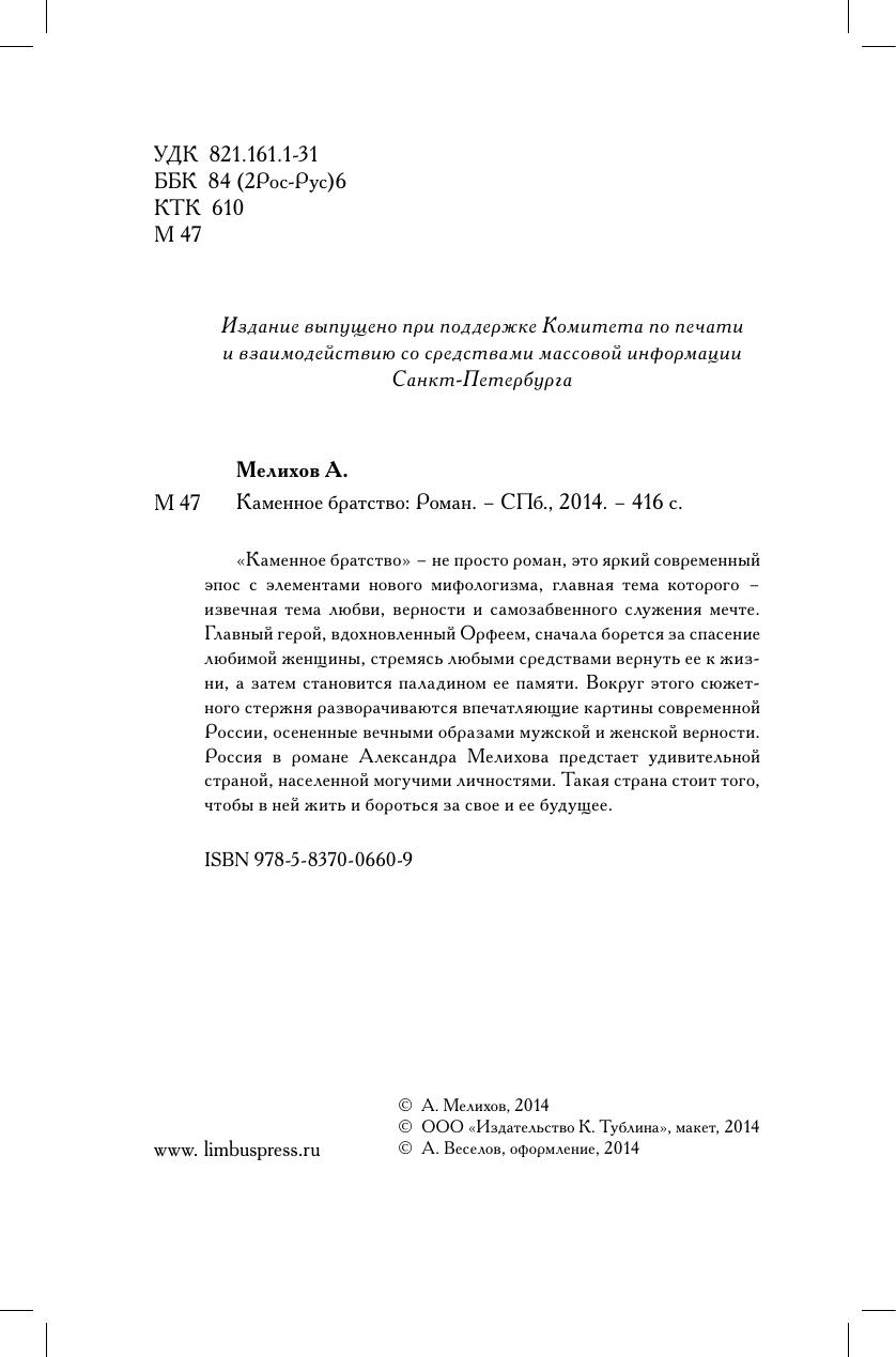 «Каменное братство» – не просто роман, это яркий со временный эпос с элементами нового мифологизма, главная тема которого – извечная тема любви, верности и самозабвенного служения мечте. Главный герой, вдохновленный Орфеем, сначала борется за спасение любимой женщины, стремясь любыми средствами вернуть ее к жизни, а затем становится паладином ее памяти. Вокруг этого сюжетного стержня разворачиваются впечатляющие картины современной России, осененные вечными образами мужской и женской верности. Россия в романе Александра Мелихова предстает удивительной страной, населенной могучими личностями. Такая страна стоит того, чтобы в ней жить и бороться за свое и ее будущее.