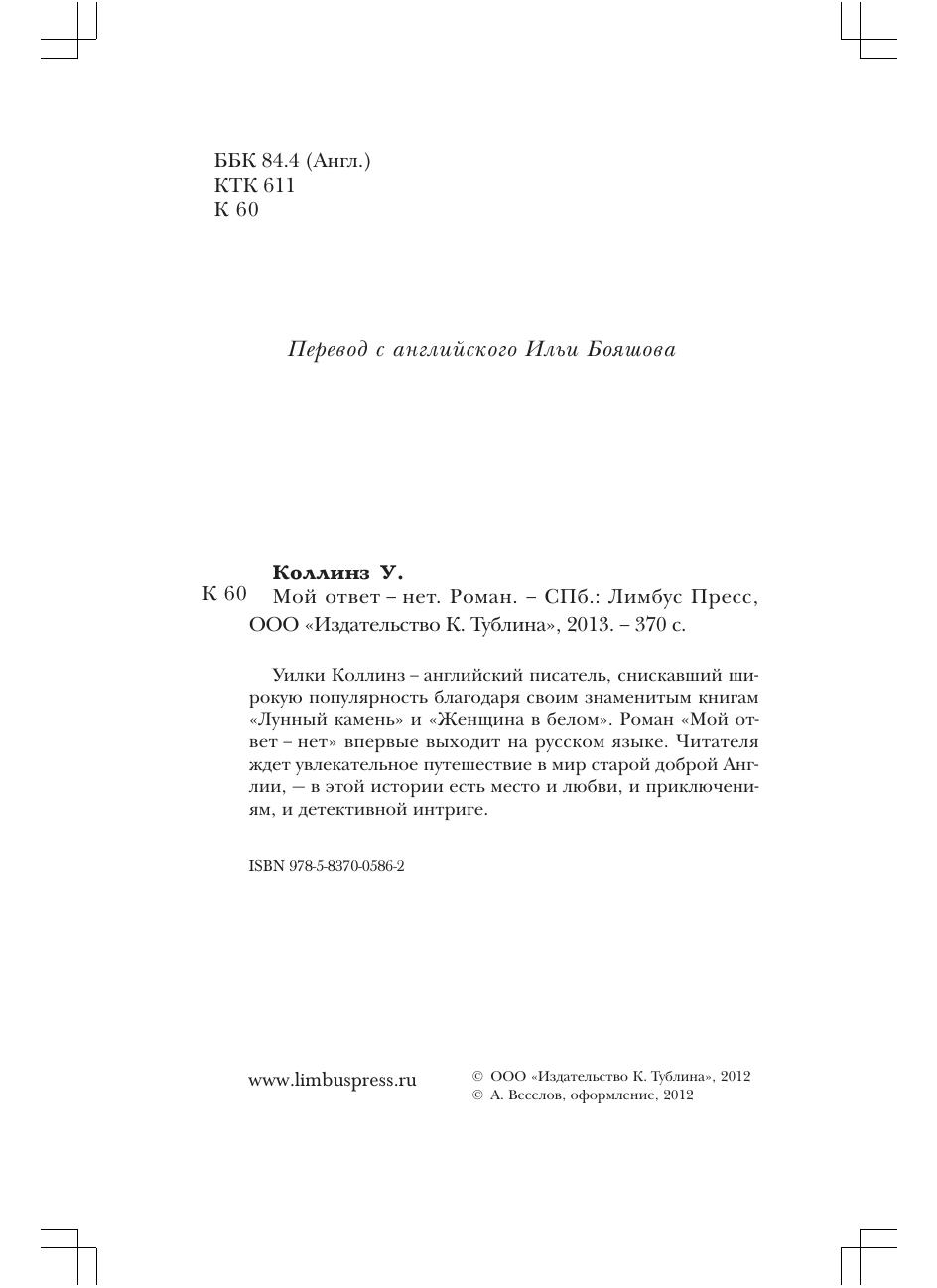 Уилки Коллинз – английский писатель, снискавший широкую популярность благодаря своим знаменитым книгам «Лунный камень» и «Женщина в белом». Роман «Мой ответ – нет» впервые выходит на русском языке. Читателя ждет увлекательное путешествие в мир старой доброй Англии, — в этой истории есть место и любви, и приключениям, и детективной интриге.