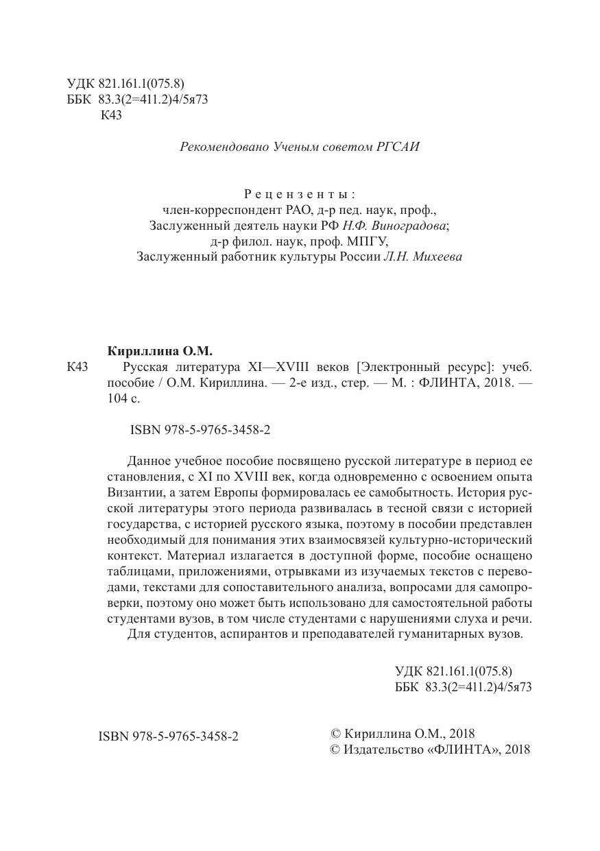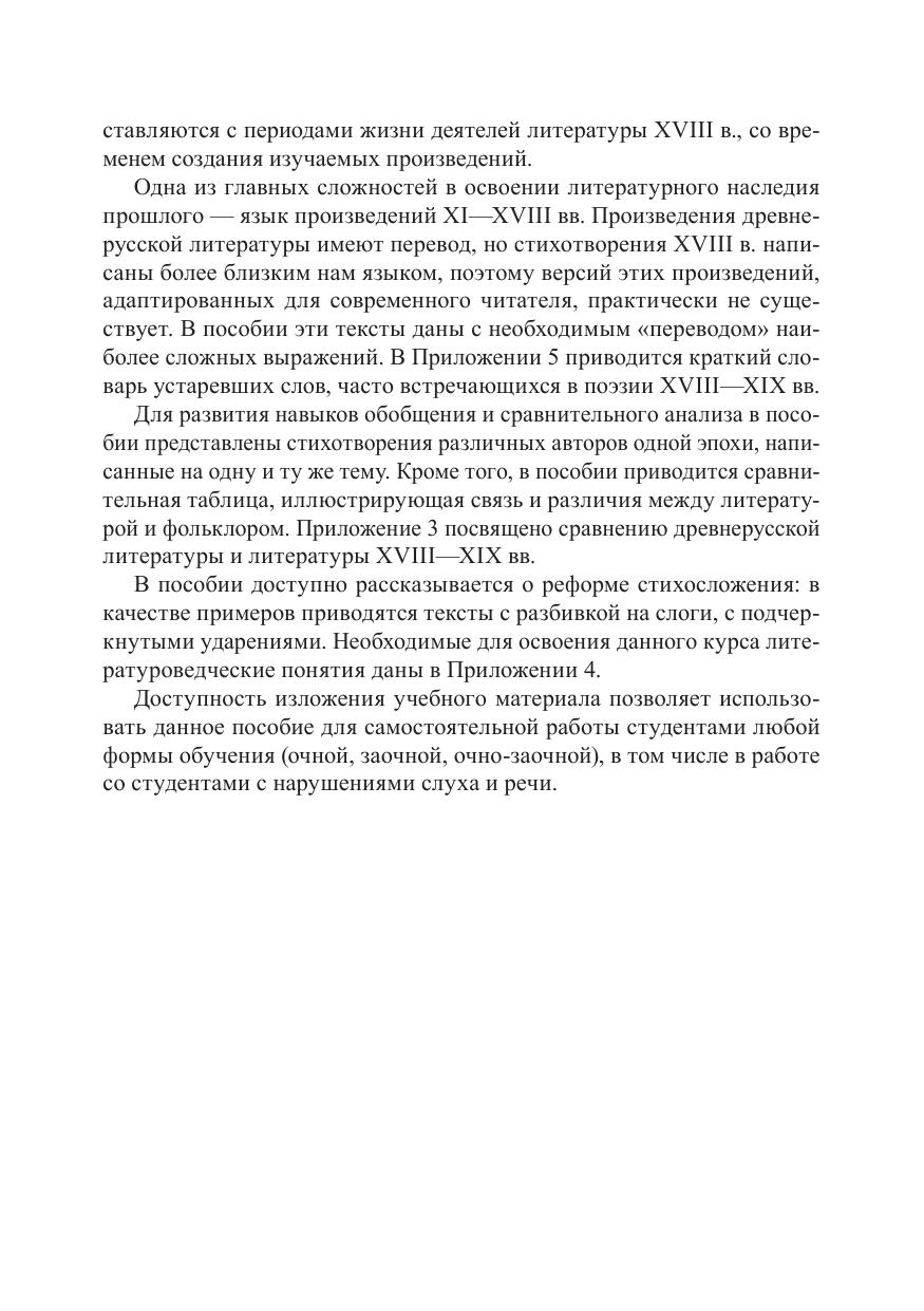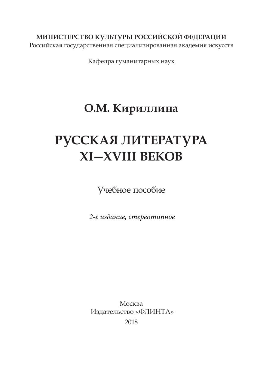 Данное учебное пособие посвящено русской литературе в период ее становления, с XI по XVIII век, когда одновременно с освоением опыта Византии, а затем Европы формировалась ее самобытность. История русской литературы этого периода развивалась в тесной связи с историей государства, с историей русского языка, поэтому в пособии представлен необходимый для понимания этих взаимосвязей культурно-исторический контекст. Материал излагается в доступной форме, пособие оснащено таблицами, приложениями, отрывками из изучаемых текстов с переводами, текстами для сопоставительного анализа, вопросами для самопроверки, поэтому оно может быть использовано для самостоятельной работы студентами вузов, в том числе студентами с нарушениями слуха и речи. Для студентов, аспирантов и преподавателей гуманитарных вузов.