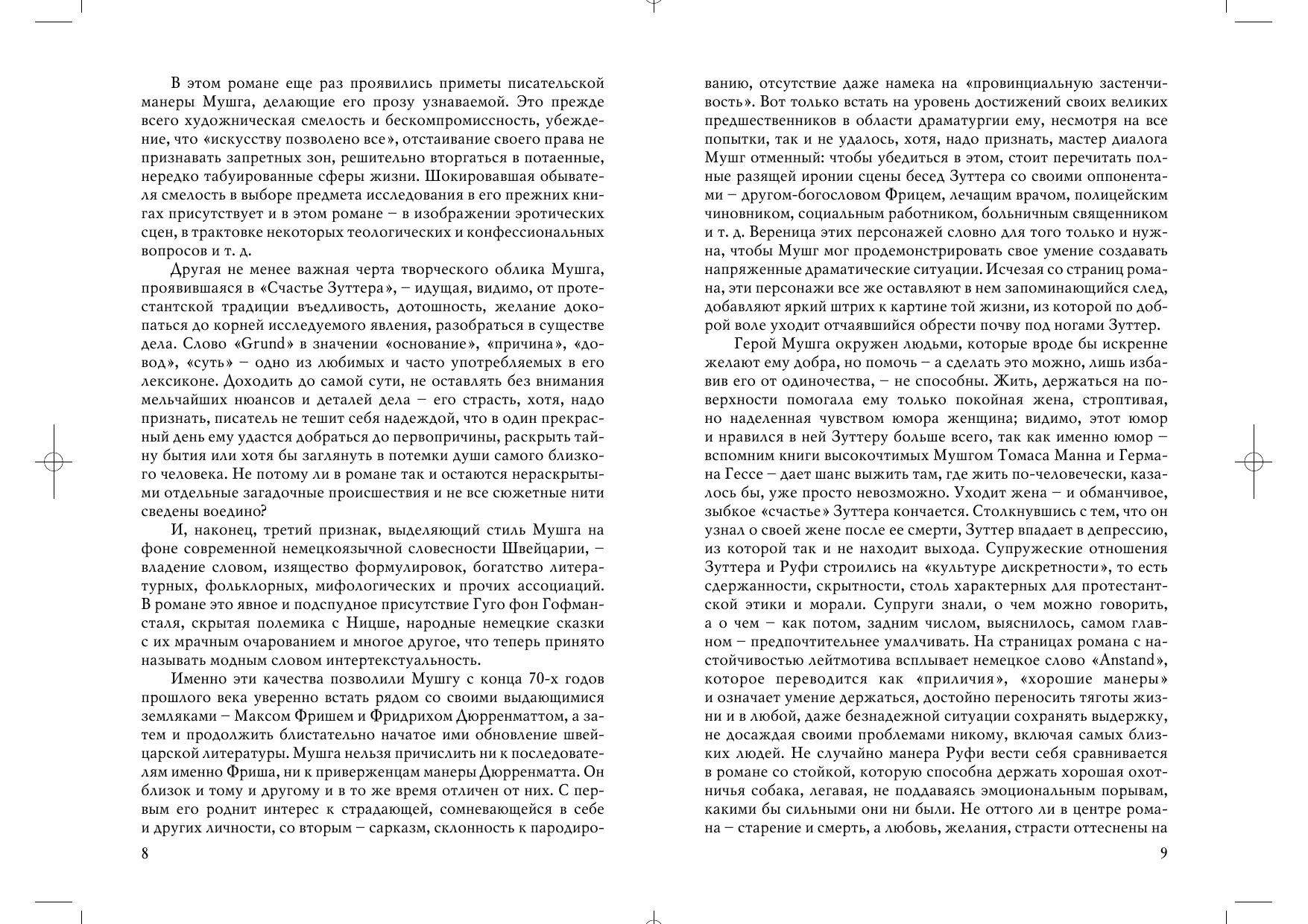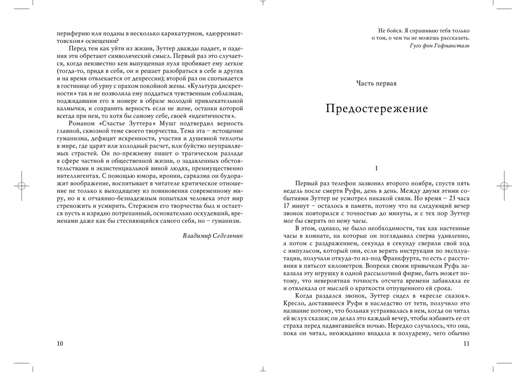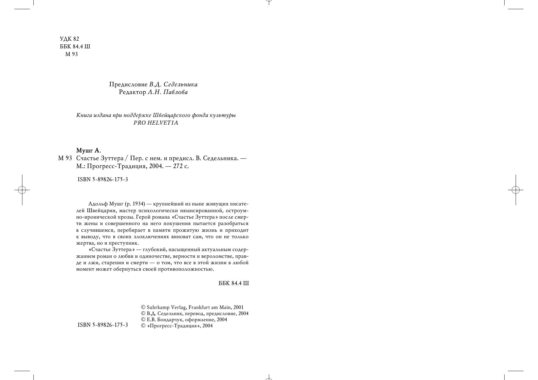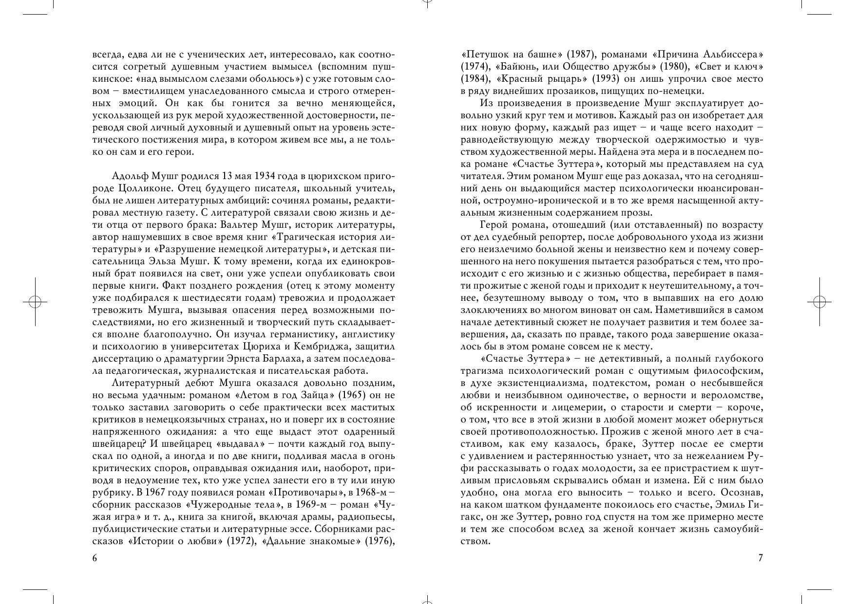 Адольф Мушг (р. 1934) — крупнейший из ныне живущих писателей Швейцарии, мастер психологически нюансированной, остроумно-иронической прозы. Герой романа "Счастье Зуттера" после смерти жены и совершенного на него покушения пытается разобраться в случившемся, перебирает в памяти прожитую жизнь и приходит к выводу, что в своих злоключениях виноват сам, что он не только жертва, но и преступник.