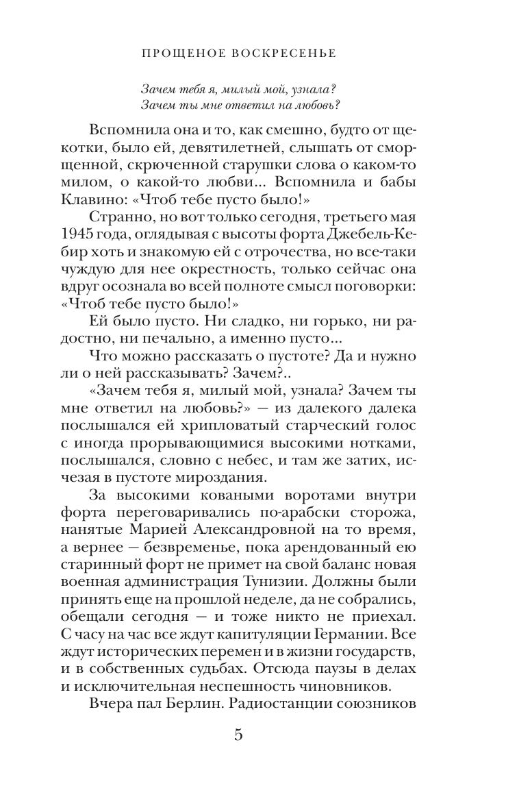 На страницах романа Вацлава Михальского «Прощеное воскресенье» (ранее вышли – «Весна в Карфагене», «Одинокому везде пустыня», «Для радости нужны двое», «Храм Согласия») продолжается повествование о судьбах главных героинь романа – Марии и Александры, дочерей адмирала Российского Императорского флота, в которых соединились пути России и Туниса, русских, арабов, французов. В романе «Прощеное воскресенье» есть и новизна материала, и сильная интрига, и живые, яркие характеры, и описания неизвестных широкой публике исторических событий XX века.
