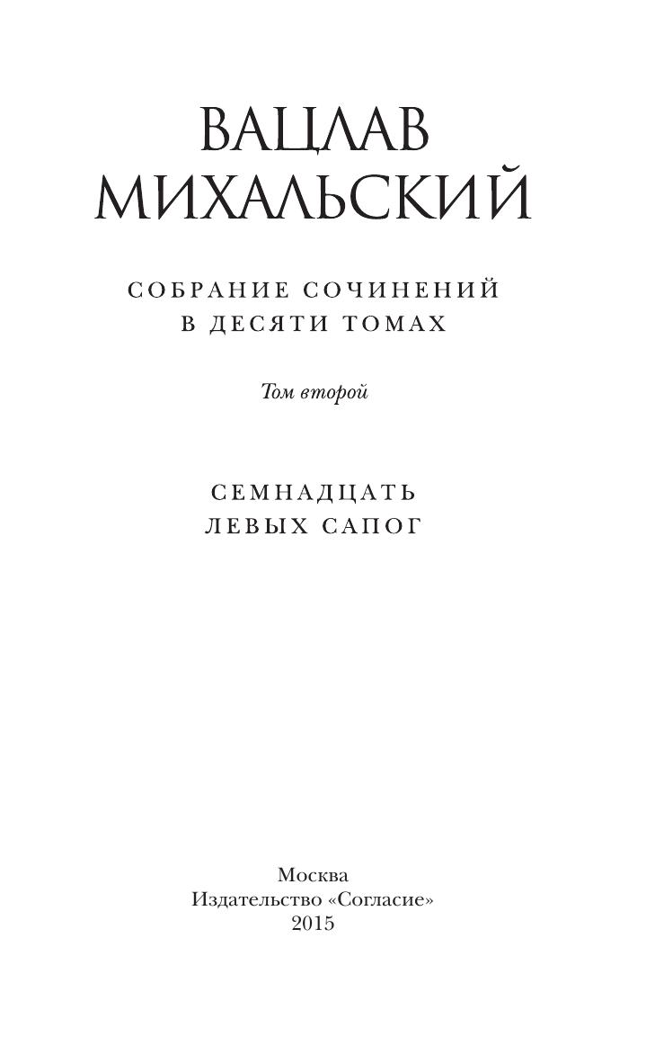 Во второй том собрания сочинений включен роман «Семнадцать левых сапог» (1964–1966), впервые увидевший свет в Дагестанском книжном издательстве в 1967 г. Это был первый роман молодого прозаика, но уже он нес в себе такие родовые черты прозы Вацлава Михальского, как богатый точный русский язык, мастерское сочетание повествовательного и изобразительного, умение воссоздавать вроде бы на малоприметном будничном материале одухотворенные характеры живых людей, выхваченных, можно сказать, из «массовки».