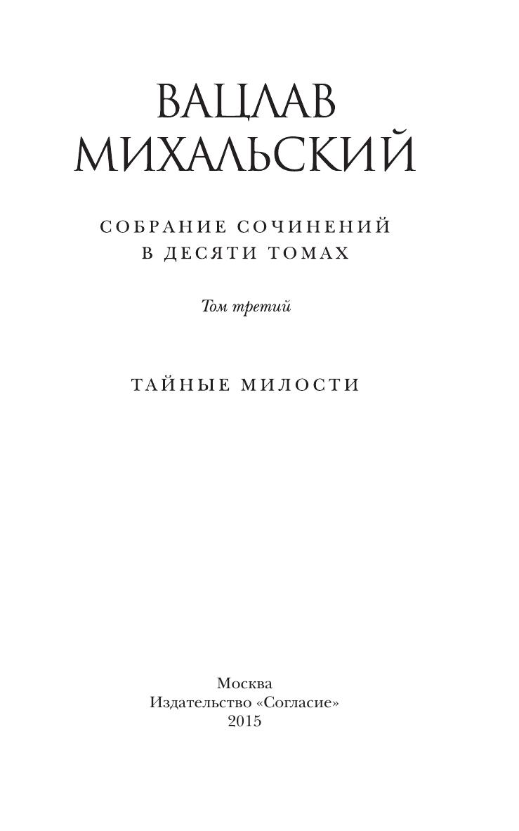 В третьем томе собрания сочинений Вацлава Михальского публикуется роман «Тайные милости» (1981–1982), выросший из цикла очерков, посвященных водоснабжению областного города. Но, как пишет сам автор, «роман, конечно, не только о воде, но и о людях, об их взаимоотношениях, о причудливом переплетении интересов».