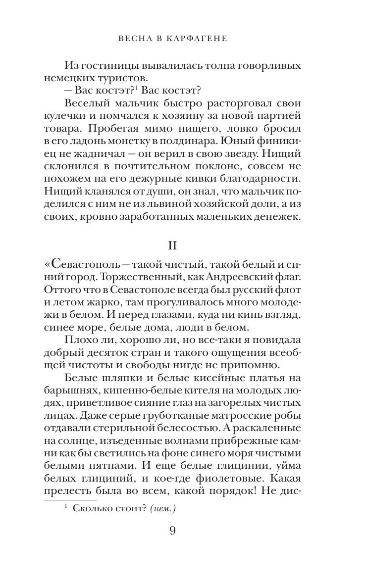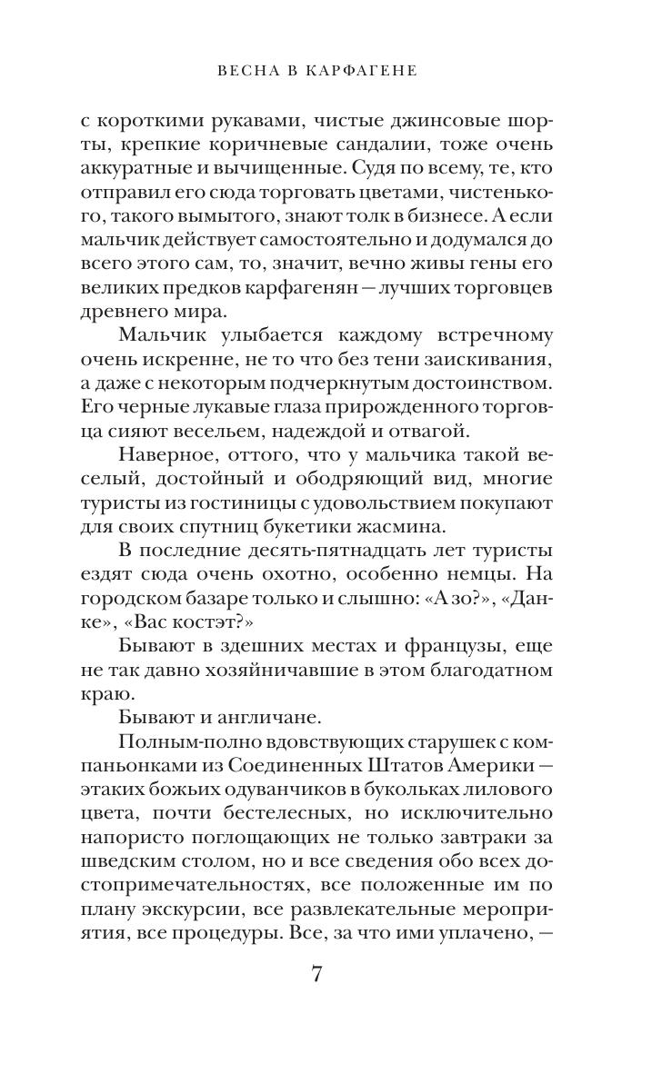 Впервые в русской литературе на страницах романа-эпопеи Вацлава Михальского «Весна в Карфагене» встретились Москва и Карфаген — Россия и Тунис, русские, арабы, французы. Они соединились в судьбах главных героинь романа — Марии и Александры, дочерей адмирала Российского Императорского флота. То, что происходит с матерью главных героинь, графиней, ставшей в новой жизни уборщицей, не менее трагично по своей силе и контрастности, чем судьба ее дочерей. В романе «Весна в Карфагене» есть и новизна материала, и сильная интрига, и живые, яркие характеры, и описания неизвестных широкой публике исторических событий ХХ века.