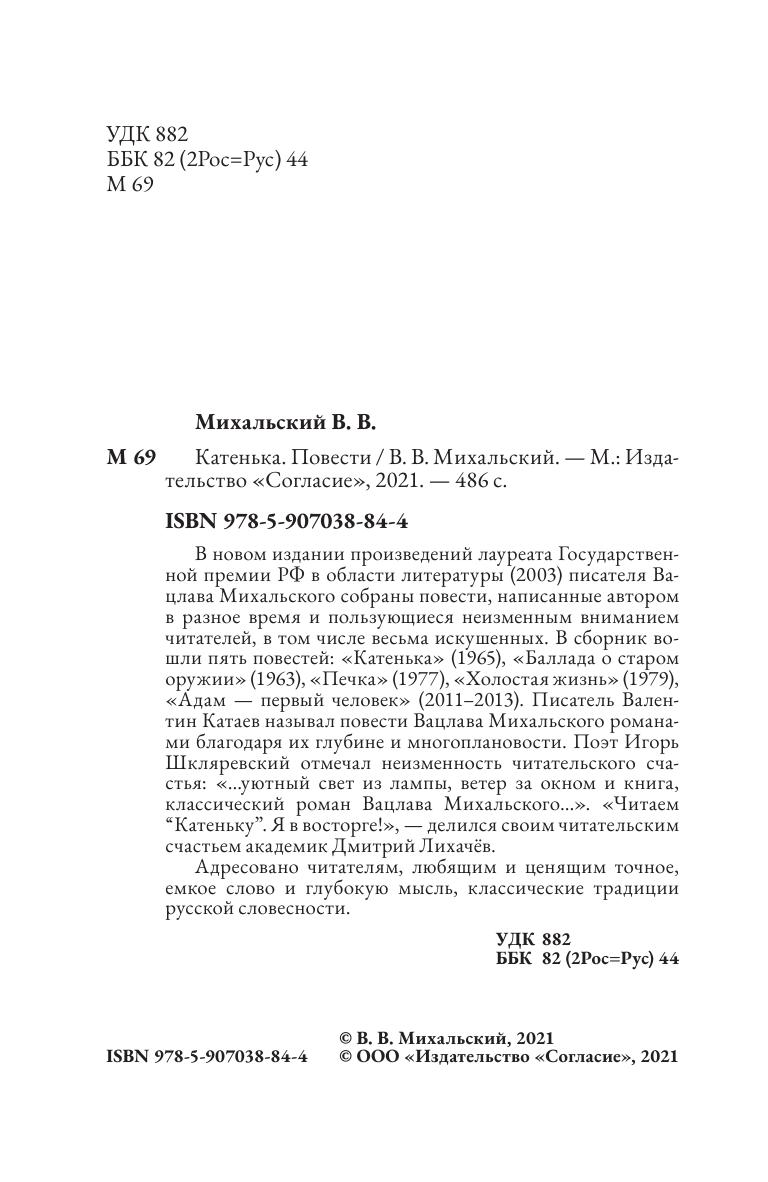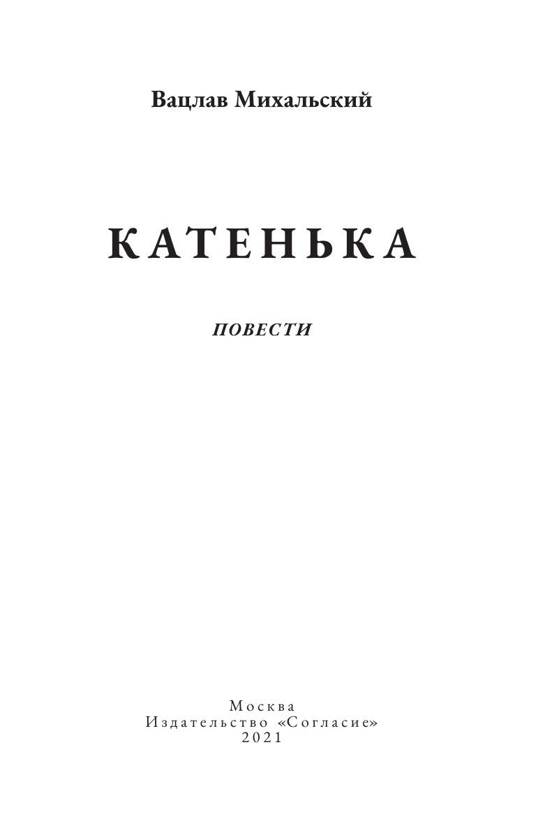 В новом издании произведений лауреата Государственной премии РФ в области литературы (2003) писателя Вацлава Михальского собраны повести, написанные автором в разное время и пользующиеся неизменным вниманием читателей, в том числе весьма искушенных. В сборник вошли пять повестей: «Катенька» (1965), «Баллада о старом оружии» (1963), «Печка» (1977), «Холостая жизнь» (1979), «Адам — первый человек» (2011–2013). Писатель Валентин Катаев называл повести Вацлава Михальского романами благодаря их глубине и многоплановости. Поэт Игорь Шкляревский отмечал неизменность читательского счастья: «…уютный свет из лампы, ветер за окном и книга, классический роман Вацлава Михальского…». «Читаем “Катеньку”. Я в восторге!», — делился своим читательским счастьем академик Дмитрий Лихачёв. Адресовано читателям, любящим и ценящим точное, емкое слово и глубокую мысль, классические традиции русской словесности.