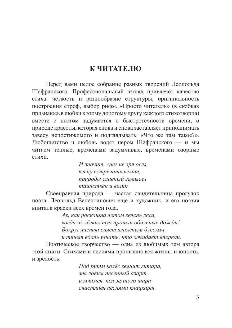 В этой книге собраны произведения, написанные автором в последние годы. Его стихи публиковались в различных сборниках в России и в журналах «Окна» (2012) и «Европейская словесность» (2013) в Германии. В 2004 году была издана первая книга «В пространстве заоконном», в 2014 году — книга «Любимая, осень...», а в 2018 году — книга «Солнце целится в лицо». Леопольд Шафранский является членом Союза писателей г. Москвы.