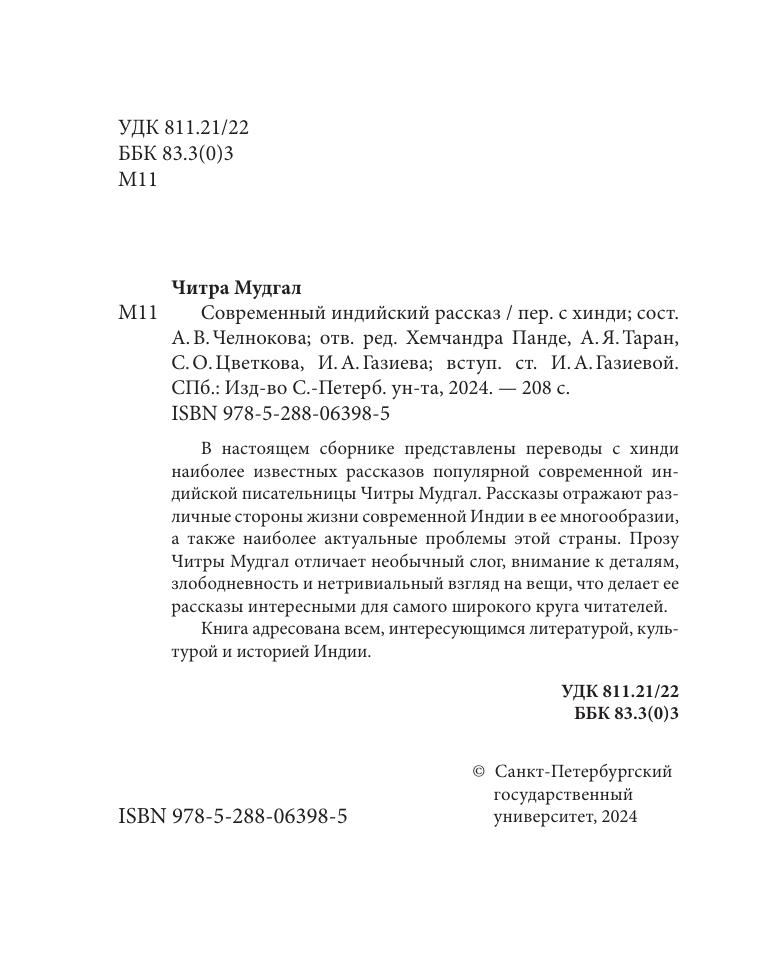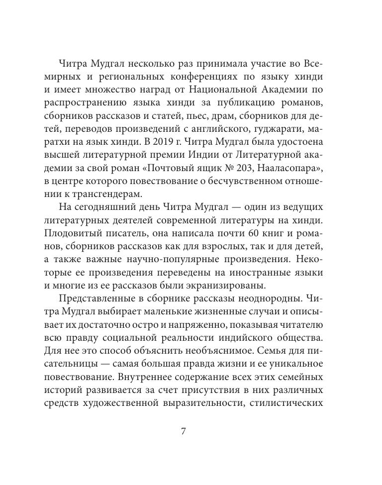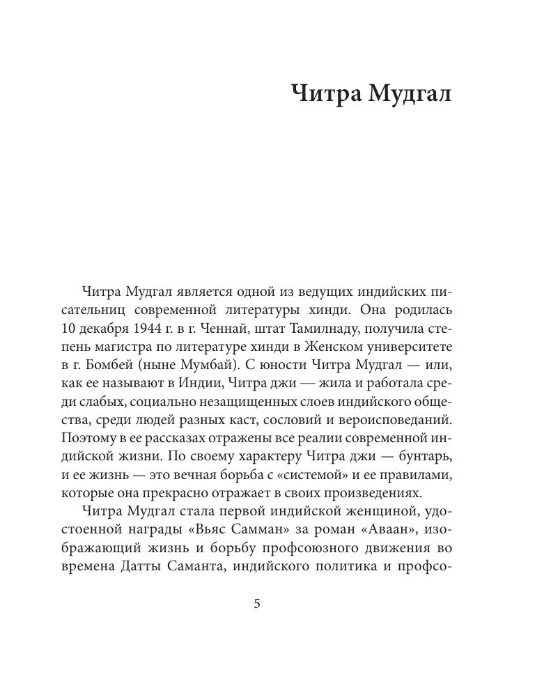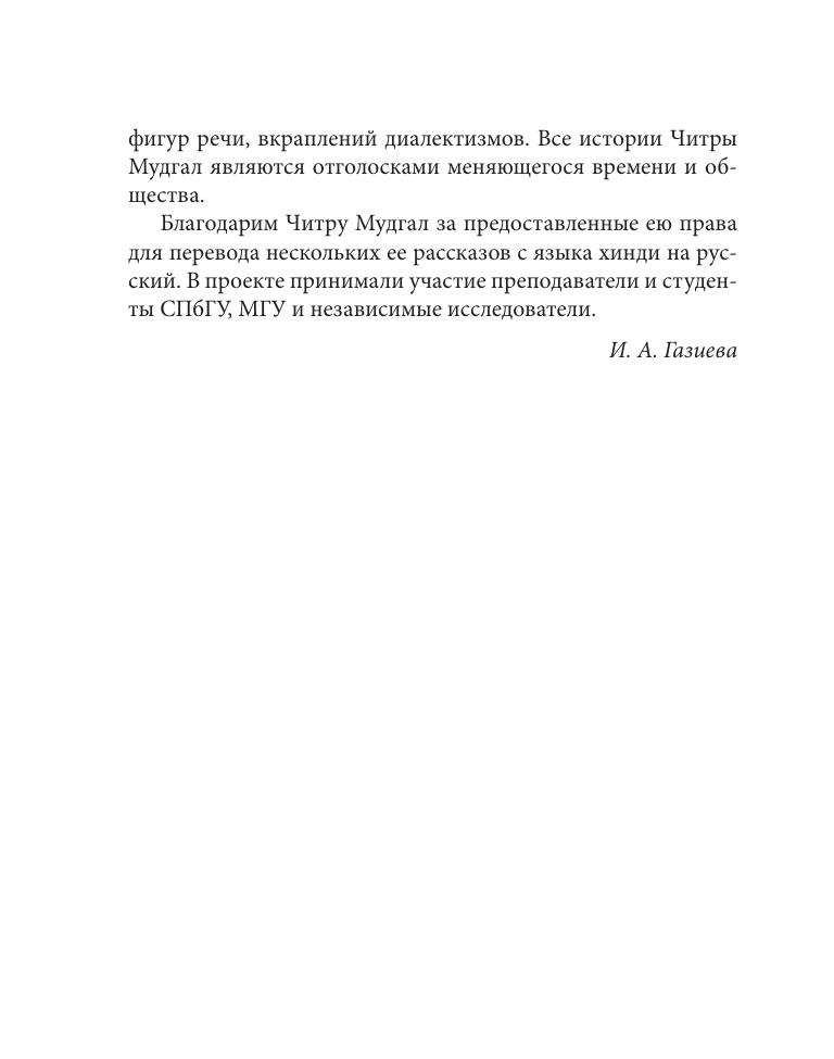 В настоящем сборнике представлены переводы с хинди наиболее известных рассказов популярной современной индийской писательницы Читры Мудгал. Рассказы отражают различные стороны жизни современной Индии в ее многообразии, а также наиболее актуальные проблемы этой страны. Прозу Читры Мудгал отличает необычный слог, внимание к деталям, злободневность и нетривиальный взгляд на вещи, что делает ее рассказы интересными для самого широкого круга читателей. Книга адресована всем, интересующимся литературой, культрурой и историей Индии.