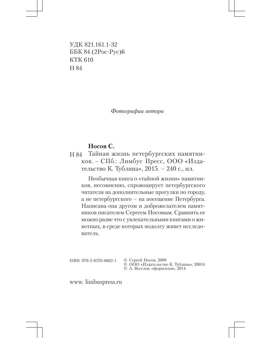 Необычная книга о «тайной жизни» памятников, несомненно, спровоцирует петербургского читателя на дополнительные прогулки по городу, а не петербургского – на посещение Петербурга. Написана она другом и доброжелателем памятников писателем Сергеем Носовым. Сравнить ее можно разве что с увлекательными книгами о животных, в среде которых подолгу живет исследователь.