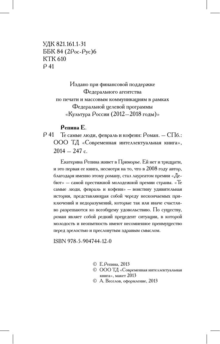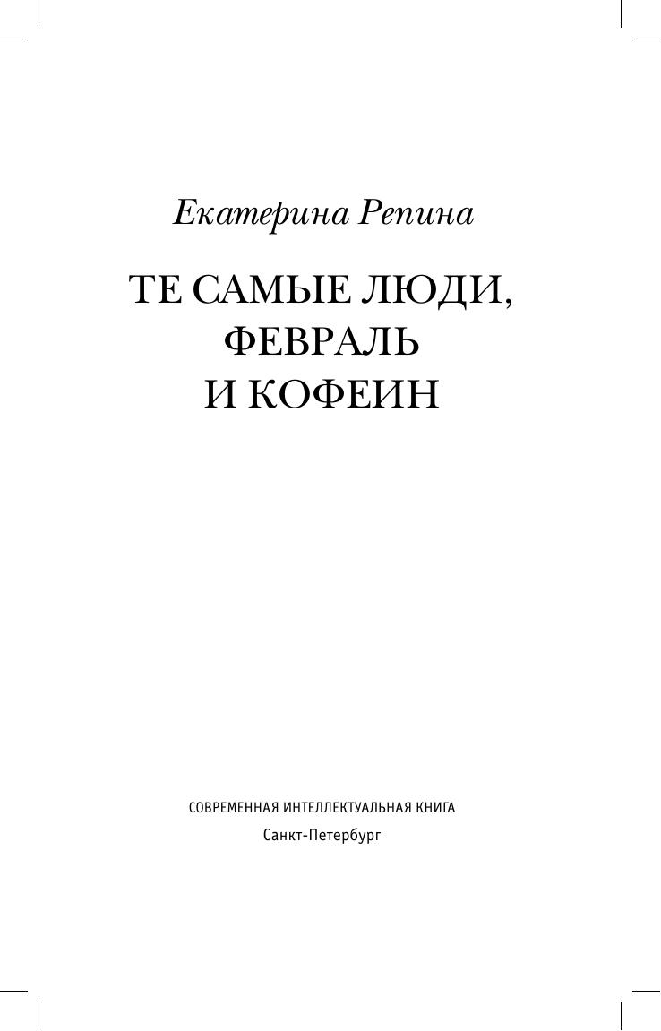 Екатерина Репина живет в Приморье. Ей нет и тридцати, и это первая ее книга, несмотря на то, что в 2008 году автор, благодаря именно этому роману, стал лауреатом премии «дебют» – самой престижной молодежной премии страны. «Те самые люди, февраль и кофеин» – воистину удивительная история, представляющая собой череду нескончаемых приключений и недоразумений, которые так или иначе счастливо разрешаются ко всеобщему удовольствию. По существу, роман являет собой редкий прецедент ситуации, в которой молодость и неопытность имеют несомненное преимущество перед зрелостью и пресловутым здравым смыслом.