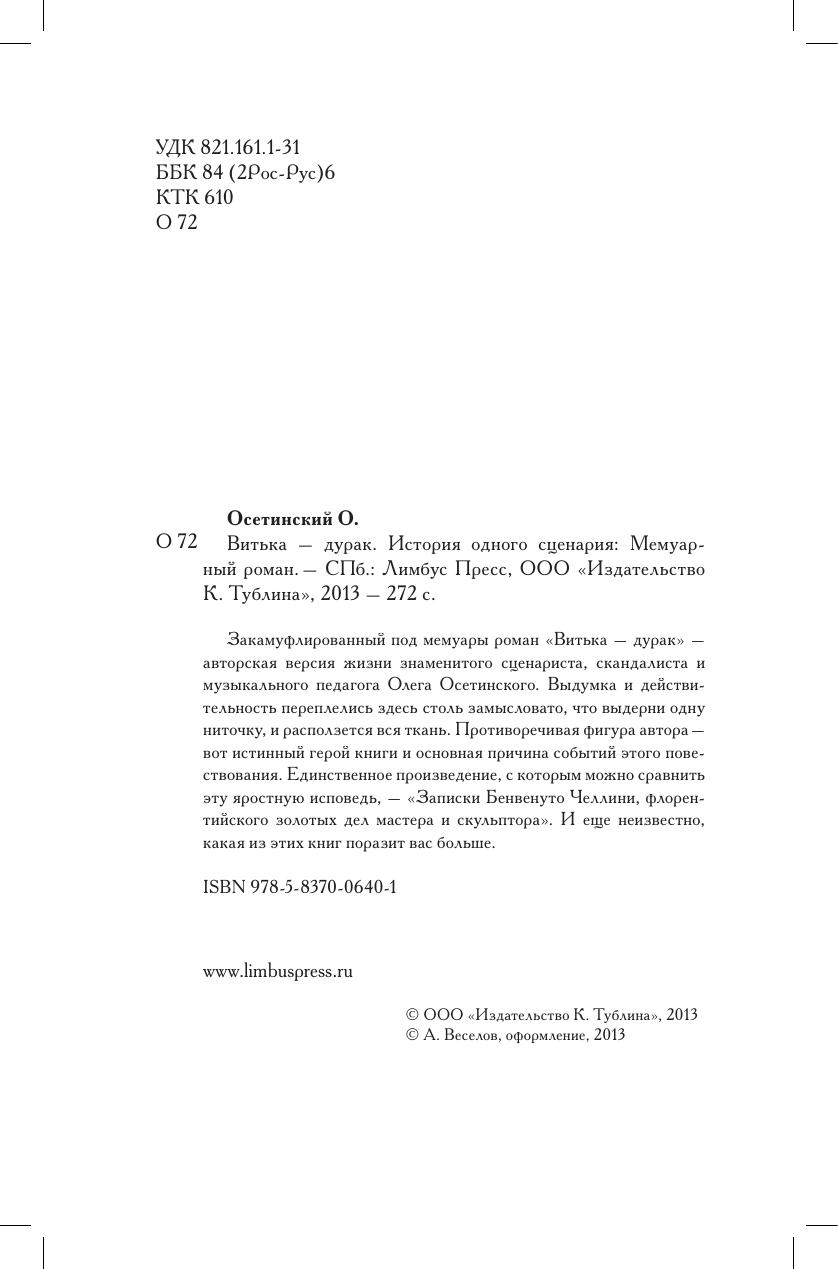 Закамуфлированный под мемуары роман «Витька – дурак» - авторская версия жизни знаменитого сценариста, скандалиста и музыкального педагога Олега Осетинского. Выдумка и действительность переплелись здесь столь замысловато, что выдерни одну ниточку, и расползется вся ткань. Противоречивая фигура автора - вот истинный герой книги и основная причина событий этого повествования. Единственное произведение, с которым можно сравнить эту яростную исповедь, – «Записки Бенвенуто Челлини, флорентийского золотых дел мастера и скульптора». И еще неизвестно, какая из этих книг поразит вас больше.