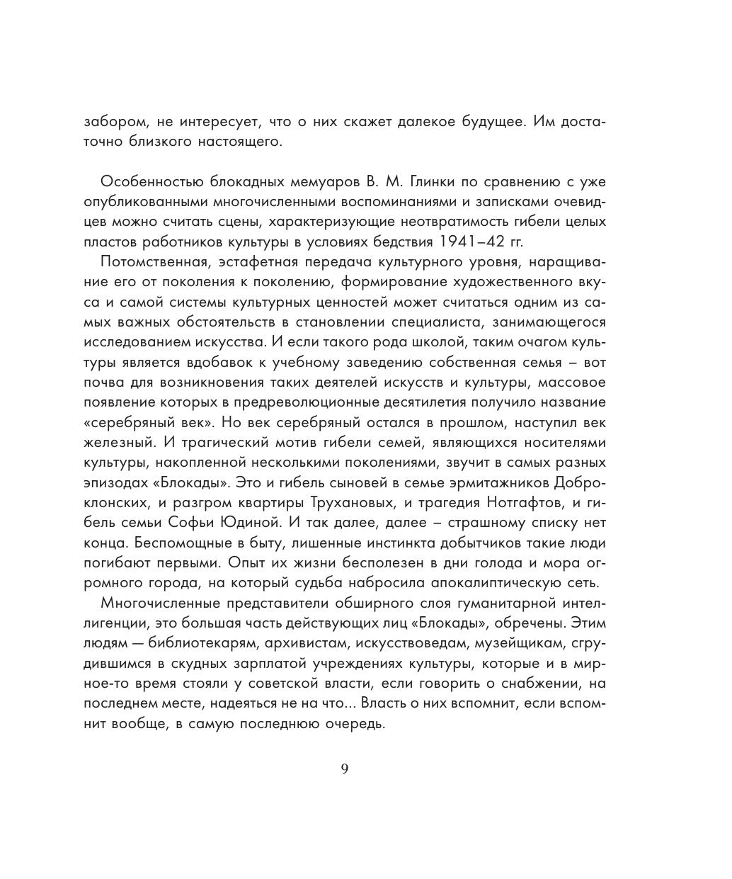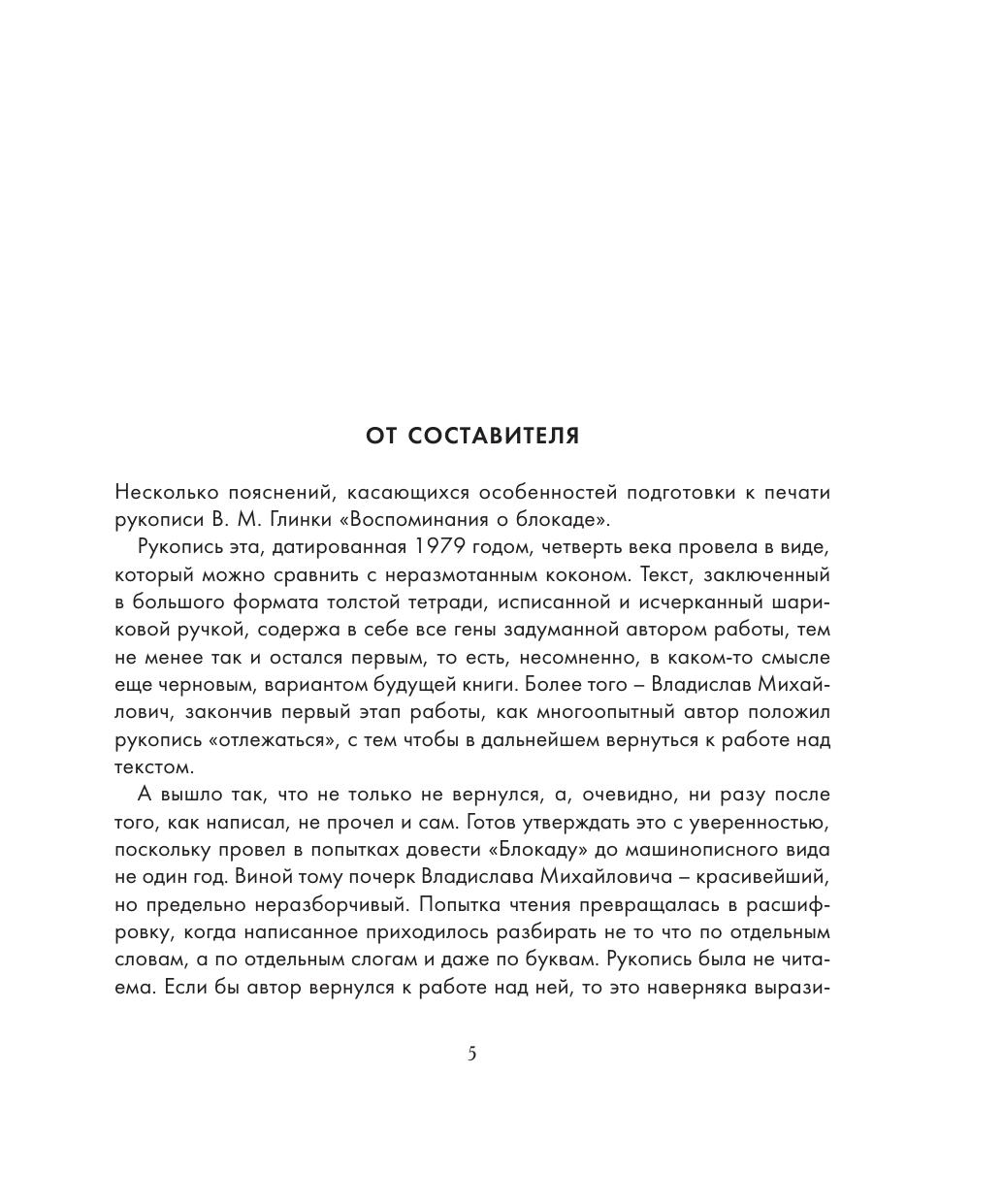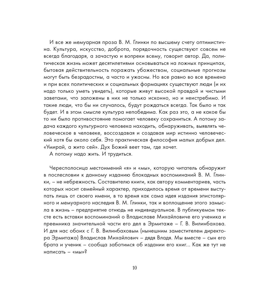 Владислав Михайлович Глинка (1903–1983) – историк, много лет проработавший в Государственном Эрмитаже, автор десятка книг научного и беллетристического содержания – пользовался в научной среде непререкаемым авторитетом как знаток русского XIX века. Он пережил блокаду Ленинграда с самого начала до самого конца, работая в это тяжелое время хранителем в Эрмитаже, фельдшером в госпитале и одновременно отвечая за сохранение коллекций ИРЛИ АН СССР («Пушкинский дом»). Рукопись «Воспоминаний о блокаде» была обнаружена наследниками В. М. Глинки после смерти автора при разборе архива. Сцены блокадной жизни, приведенные в книге, не требуют ни объяснений, ни дополнений. Издание проиллюстрировано уникальными архивными фотографиями.