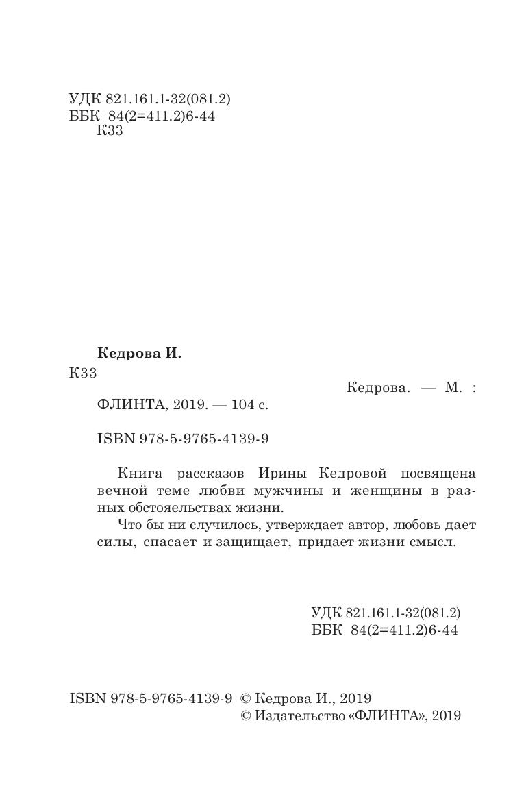 Книга рассказов Ирины Кедровой посвящена вечной теме любви мужчины и женщины в разных обстоятельствах жизни.