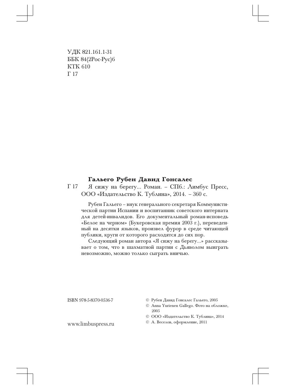 Рубен Гальего - внук генерального секретаря Коммунистической партии Испании и воспитанник советского интерната для детей-инвалидов. Его документальный роман-исповедь "Белое на черном" (Букеровская премия 2003 г.), переведенный на десятки языков, произвел фурор в среде читающей публики, круги от которого расходятся до сих пор. Следующий роман автора "Я сижу на берегу..." рассказывает о том, что в шахматной партии с Дьяволом выиграть невозможно, можно только сыграть вничью.