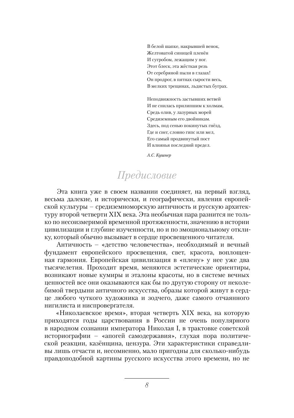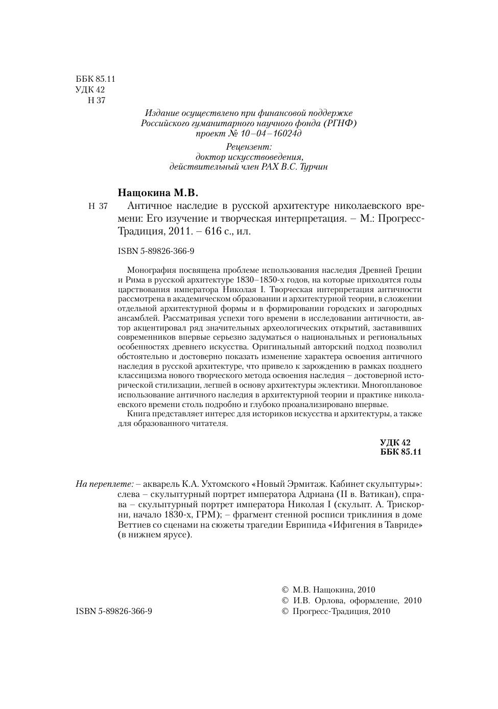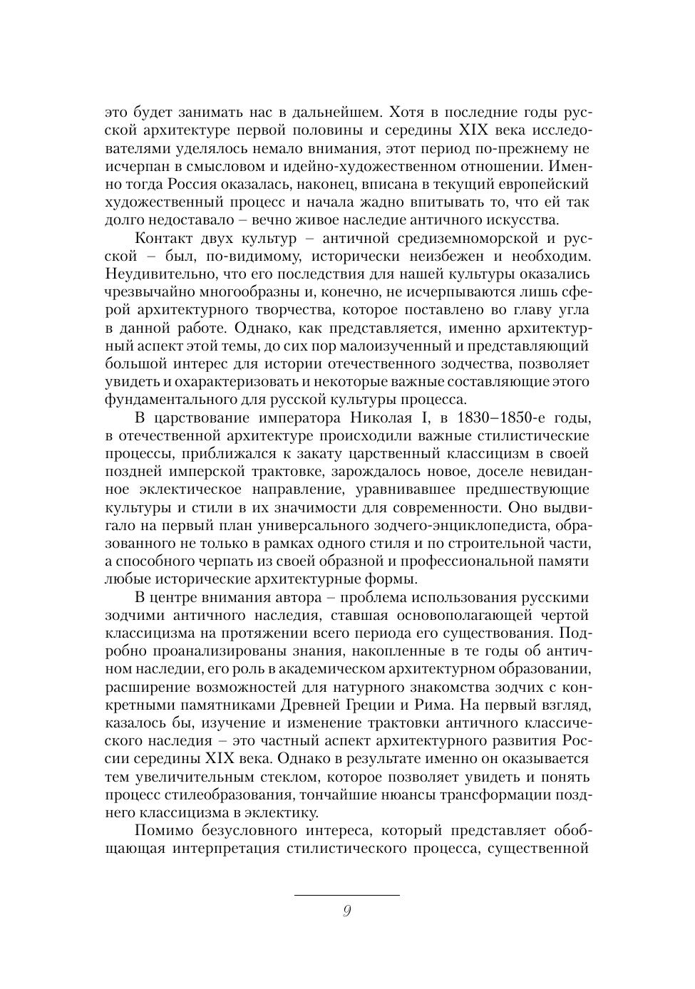 Монография посвящена проблеме использования наследия Древней Греции и Рима в русской архитектуре 1830–1850-х годов, на которые приходятся годы царствования императора Николая I. Творческая интерпретация античности рассмотрена в академическом образовании и архитектурной теории, в сложении отдельной архитектурной формы и в формировании городских и загородных ансамблей. Рассматривая успехи того времени в исследовании античности, автор акцентировал ряд значительных археологических открытий, заставивших современников впервые серьезно задуматься о национальных и региональных особенностях древнего искусства. Оригинальный авторский подход позволил обстоятельно и достоверно показать изменение характера освоения античного наследия в русской архитектуре, что привело к зарождению в рамках позднего классицизма нового творческого метода освоения наследия – достоверной исторической стилизации, легшей в основу архитектуры эклектики. Многоплановое использование античного наследия в архитектурной теории и практике николаевского времени столь подробно и глубоко проанализировано впервые.