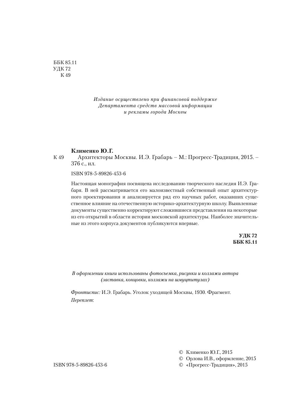 Настоящая монография посвящена исследованию творческого наследия И.Э. Грабаря. В ней рассматривается его малоизвестный собственный опыт архитектурного проектирования и анализируется ряд его научных работ, оказавших существенное влияние на отечественную историко-архитектурную школу. Выявленные документы существенно корректируют сложившиеся представления на некоторые из его открытий в области истории московской архитектуры. Наиболее значительные из этого корпуса документов публикуются впервые.