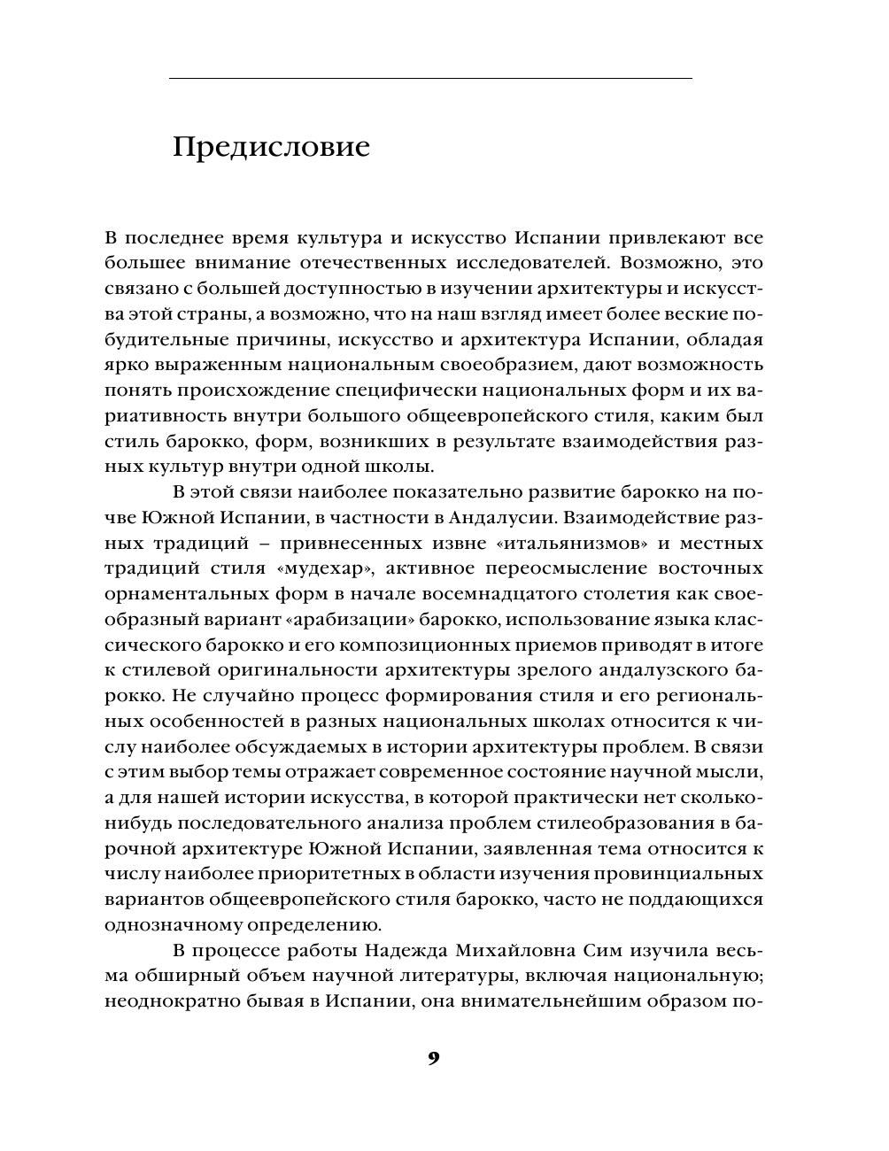 Ее основу составляет подробный исторический и искусствоведческий анализ архитектуры Андалусии Нового времени. Автором разработана новая система классификации памятников зодчества как единой исторической картины формирования стиля барокко от ее истоков королевского двора Мадрида до расцвета «пышного» андалузского барокко.
