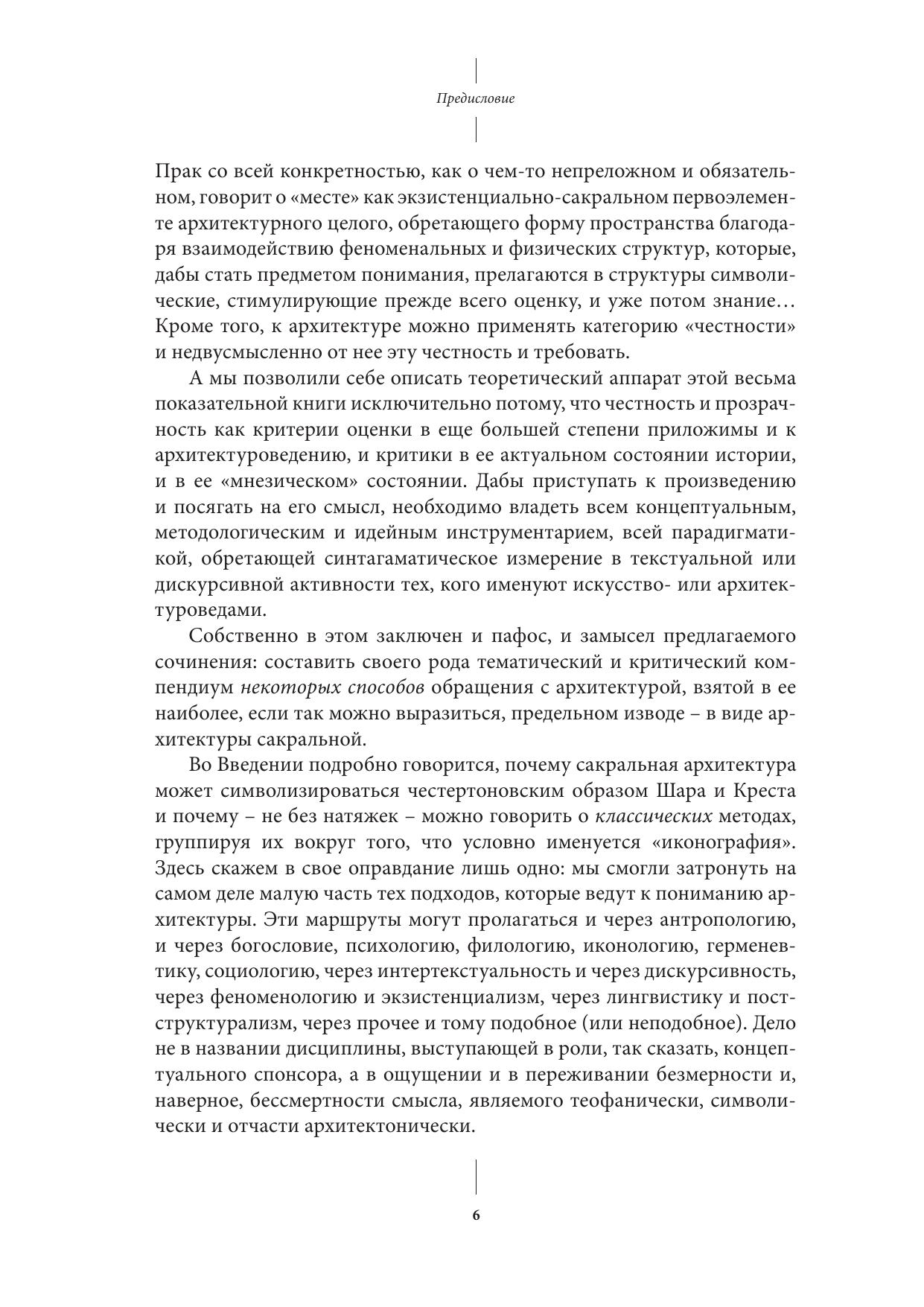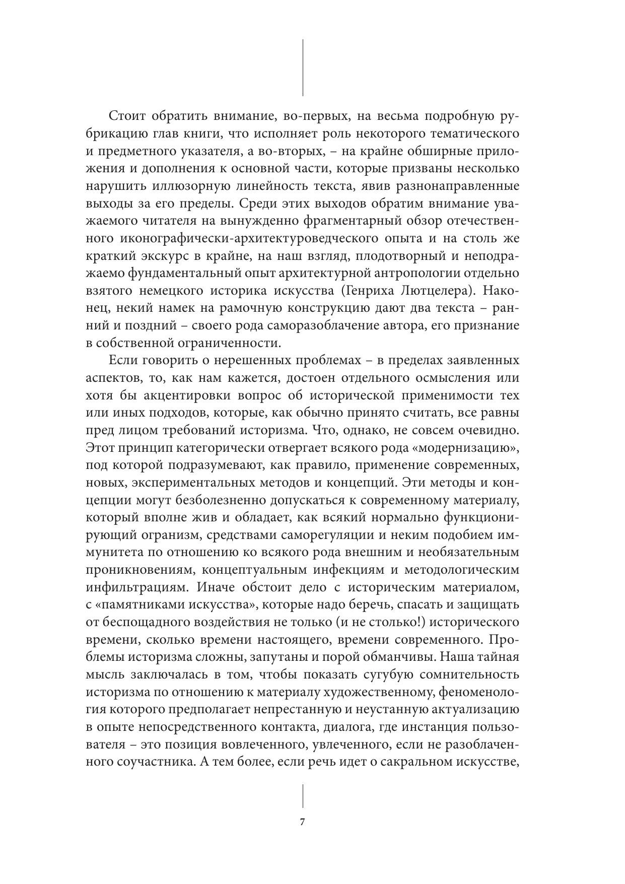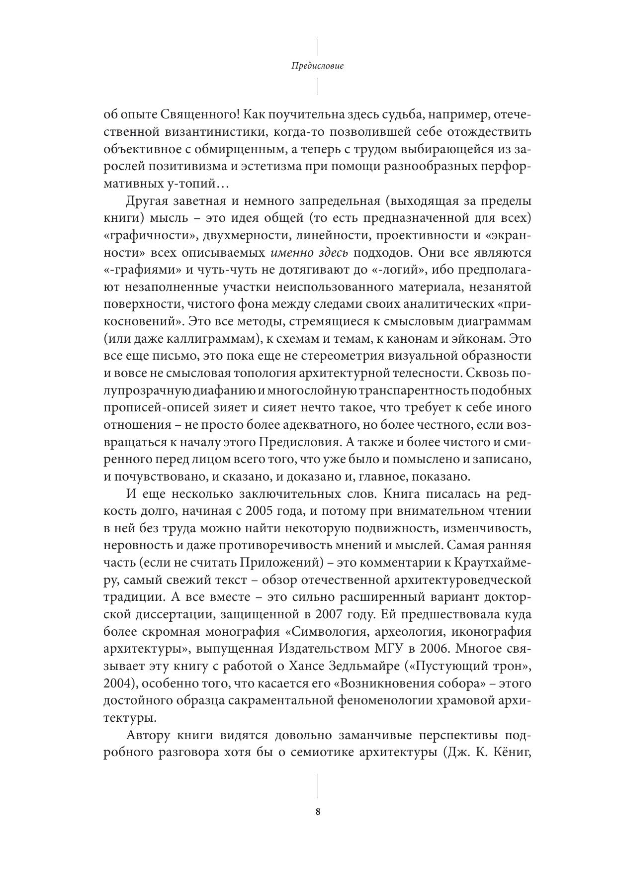 Впервые в науке об искусстве предпринимается попытка систематического анализа проблем интерпретации сакрального зодчества. В рамках общей герменевтики архитектуры выделяется иконографический подход и выявляются его основные варианты, представленные именами Й. Зауэра (символика Дома Божия), Э. Маля (архитектура как иероглиф священного), Р. Краутхаймера (собственно – иконография архитектурных архетипов), А. Грабара (архитектура как система семантических полей), Ф.-В. Дайхманна (символизм архитектуры как археологической предметности) и Ст. Синдинг-Ларсена (семантика литургического пространства). Признаются несомненные ограничения иконографии, заставляющие продолжать поиски иных приемов описания и толкования архитектурно- литургического целого – храмового тела, понимаемого и как "тело символа", как форма и средство теофании. В обширных Приложениях представлен в том числе и обзор отечественного опыта архитектурной иконографии.