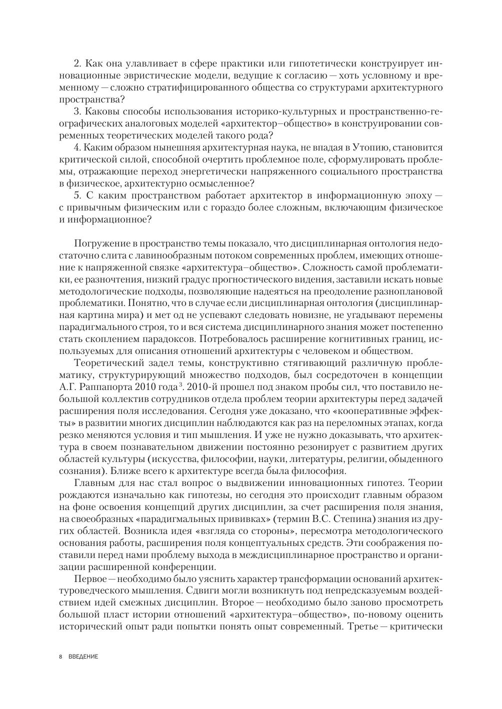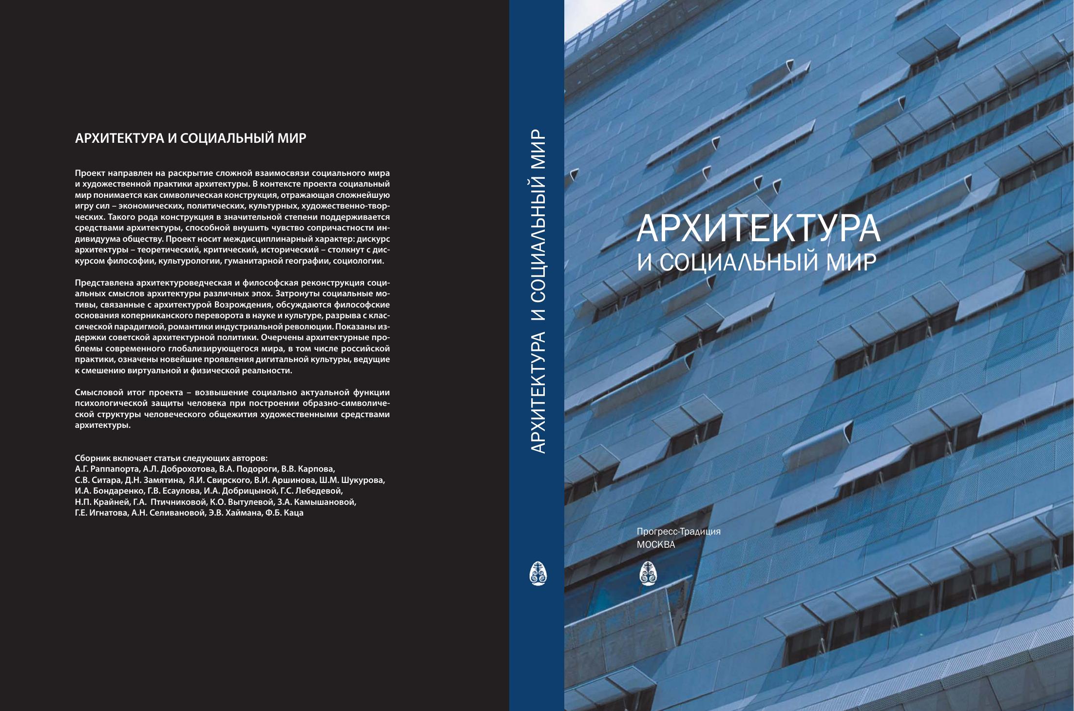 Представлена архитектуроведческая и философская реконструкция социальных смыслов архитектуры различных эпох. Затронуты социальные мотивы, связанные с архитектурой Возрождения, обсуждаются философские основания коперниканского переворота в науке и культуре, разрыва с классической парадигмой, романтики индустриальной революции. Показаны издержки советской архитектурной политики. Очерчены архитектурные проблемы современного глобализирующегося мира, в том числе российской практики, означены новейшие проявления дигитальной культуры, ведущие к смешению виртуальной и физической реальности. Смысловой итог проекта – возвышение социально актуальной функции психологической защиты человека при построении образно-символической структуры человеческого общежития художественными средствами архитектуры.