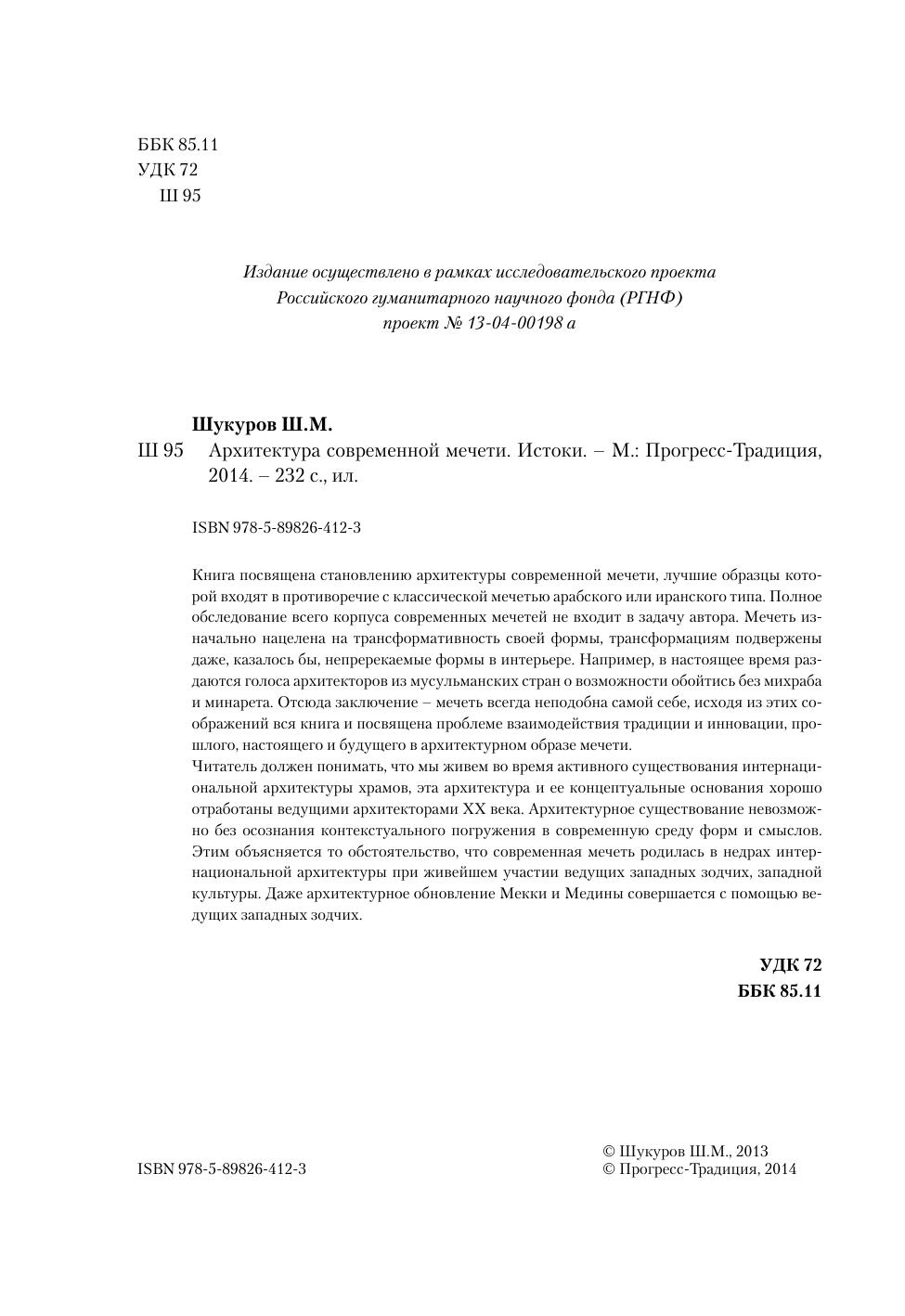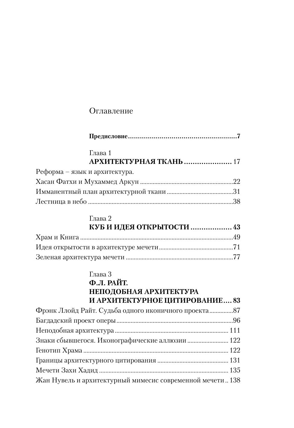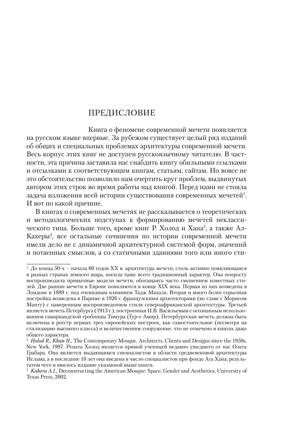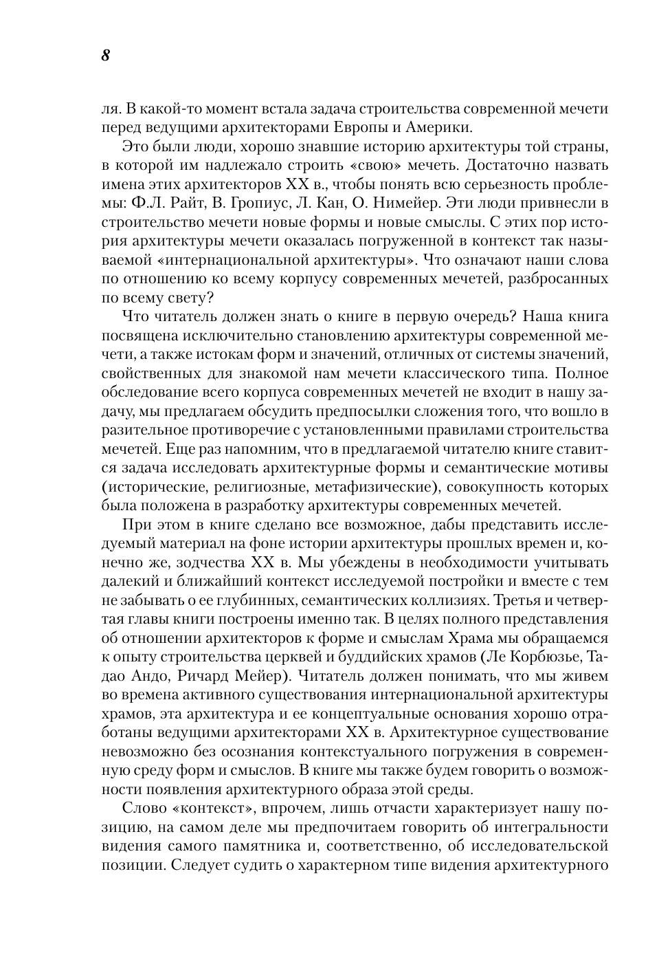 Книга посвящена становлению архитектуры современной мечети, лучшие образцы которой входят в противоречие с классической мечетью арабского или иранского типа. Полное обследование всего корпуса современных мечетей не входит в задачу автора. Мечеть изначально нацелена на трансформативность своей формы, трансформациям подвержены даже, казалось бы, непререкаемые формы в интерьере. Например, в настоящее время раздаются голоса архитекторов из мусульманских стран о возможности обойтись без михраба и минарета. Отсюда заключение – мечеть всегда неподобна самой себе, исходя из этих соображений вся книга и посвящена проблеме взаимодействия традиции и инновации, прошлого, настоящего и будущего в архитектурном образе мечети.
