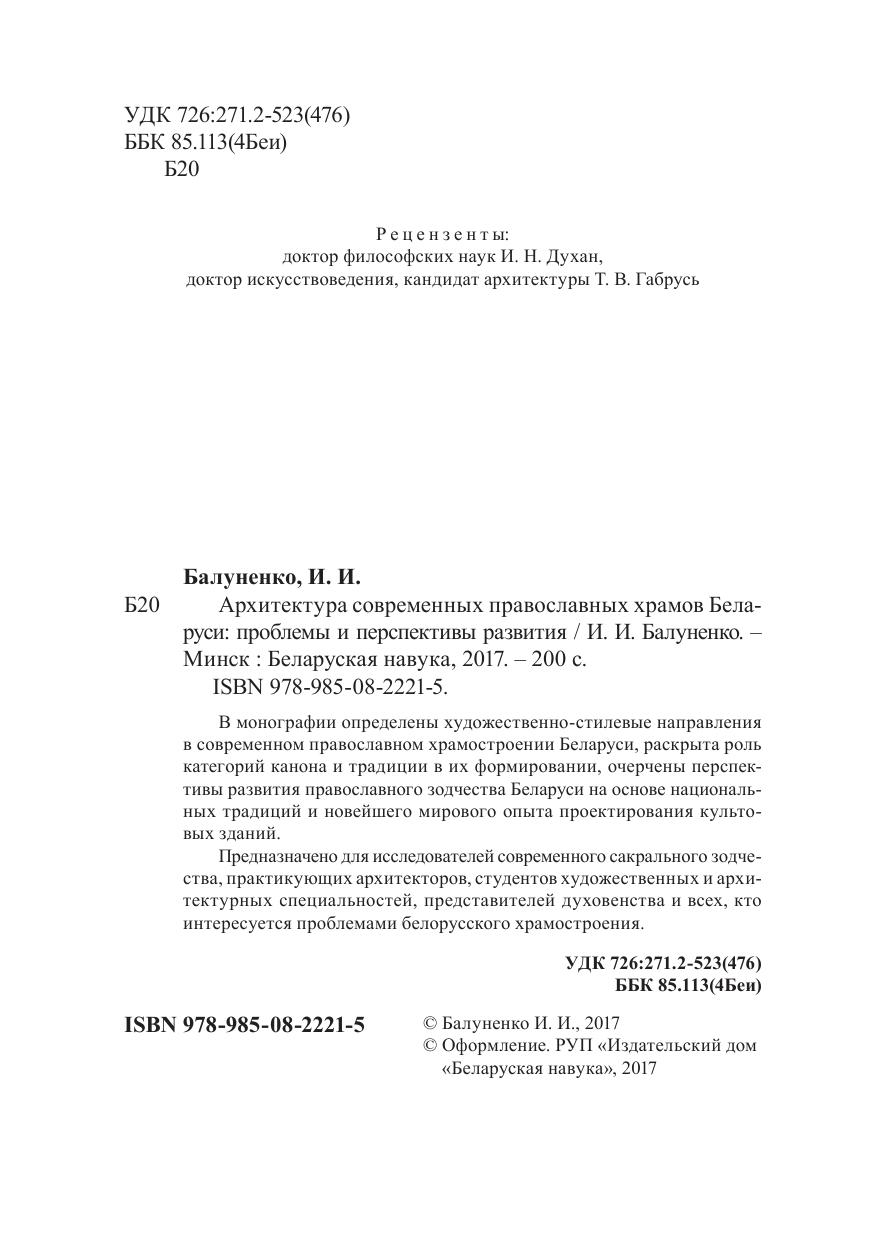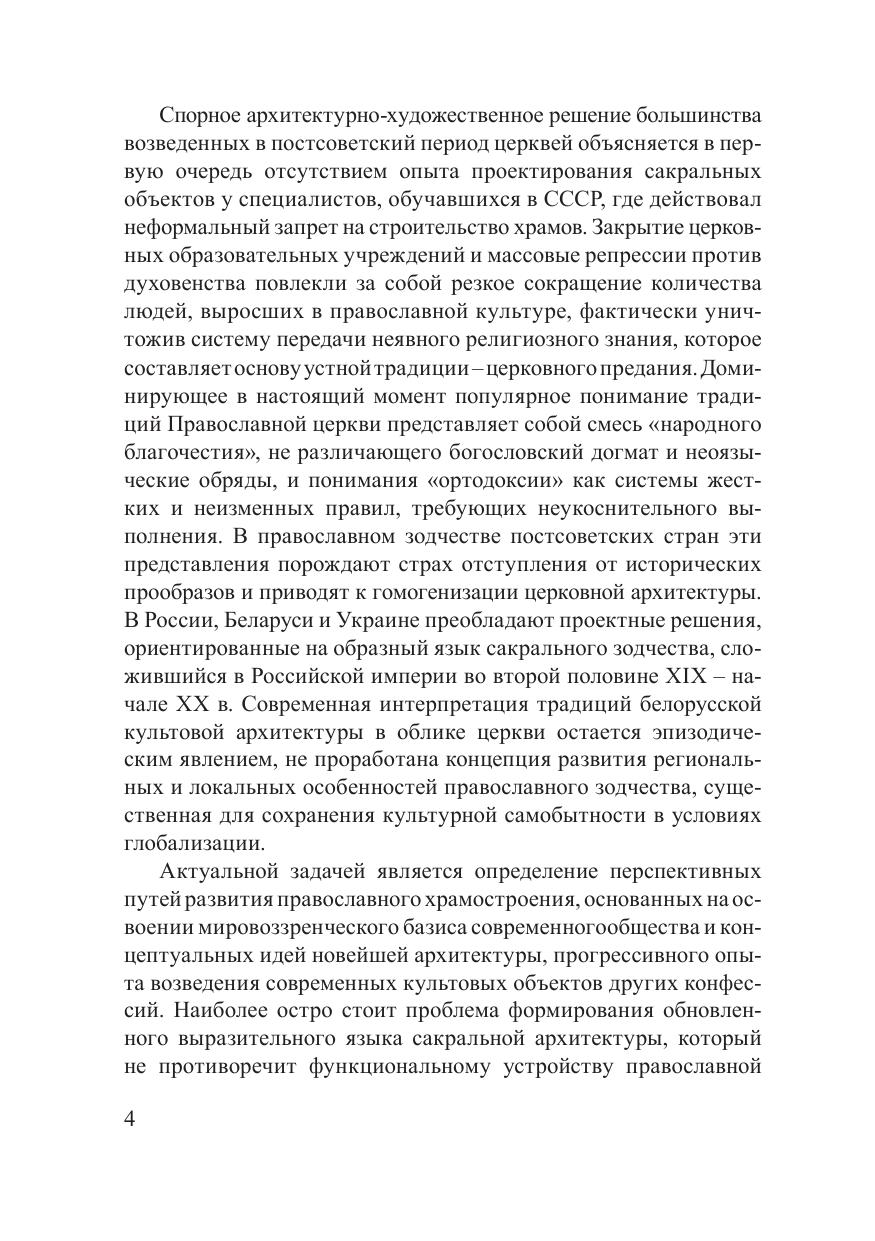 В монографии определены художественно-стилевые направления в современном православном храмостроении Беларуси, раскрыта роль категорий канона и традиции в их формировании, очерчены перспективы развития православного зодчества Беларуси на основе национальных традиций и новейшего мирового опыта проектирования культовых зданий. Предназначено для исследователей современного сакрального зодчества, практикующих архитекторов, студентов художественных и архитектурных специальностей, представителей духовенства и всех, кто интересуется проблемами белорусского храмостроения.