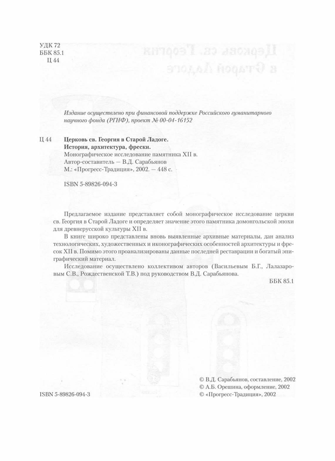 Предлагаемое издание представляет собой монографическое исследование церкви св. Георгия в Старой Ладоге и определяет значение этого памятника домонгольской эпохи для древнерусской культуры XII в. В книге широко представлены вновь выявленные архивные материалы, дан анализ технологических, художественных и иконографических особенностей архитектуры и фресок XII в. Помимо этого проанализированы данные последней реставрации и богатый эпиграфический материал. Исследование осуществлено коллективом авторов (Васильевым Б.Г., Лалазаровым С В., Рождественской Т.В.) под руководством В.Д. Сарабьянова.