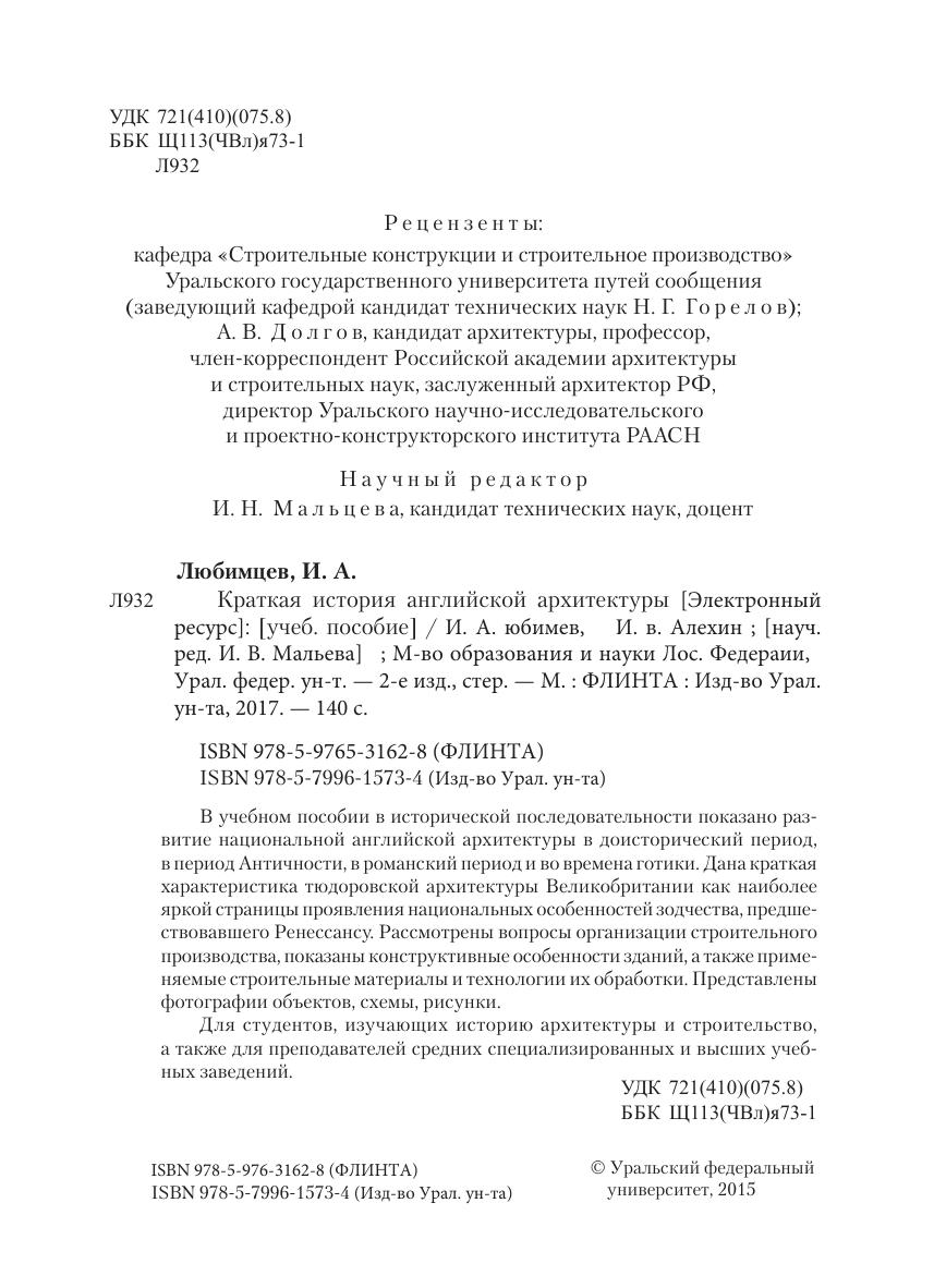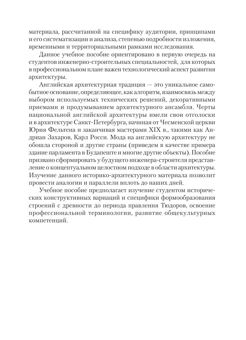 В учебном пособии в исторической последовательности показано развитие национальной английской архитектуры в доисторический период, в период Античности, в романский период и во времена готики. Дана краткая характеристика тюдоровской архитектуры Великобритании как наиболее яркой страницы проявления национальных особенностей зодчества, предшествовавшего Ренессансу. Рассмотрены вопросы организации строительного производства, показаны конструктивные особенности зданий, а также применяемые строительные материалы и технологии их обработки. Представлены фотографии объектов, схемы, рисунки. Для студентов, изучающих историю архитектуры и строительство, а также для преподавателей средних специализированных и высших учебных заведений.