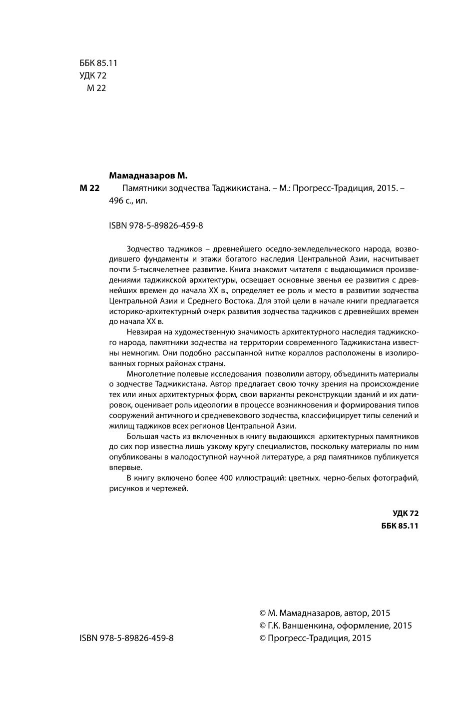 Зодчество таджиков – древнейшего оседло-земледельческого народа, возводившего фундаменты и этажи богатого наследия Центральной Азии, насчитывает почти 5-тысячелетнее развитие. Книга знакомит читателя с выдающимися произведениями таджикской архитектуры, освещает основные звенья ее развития с древнейших времен до начала XX в., определяет ее роль и место в развитии зодчества Центральной Азии и Среднего Востока. Для этой цели в начале книги предлагается историко-архитектурный очерк развития зодчества таджиков с древнейших времен до начала XX в.