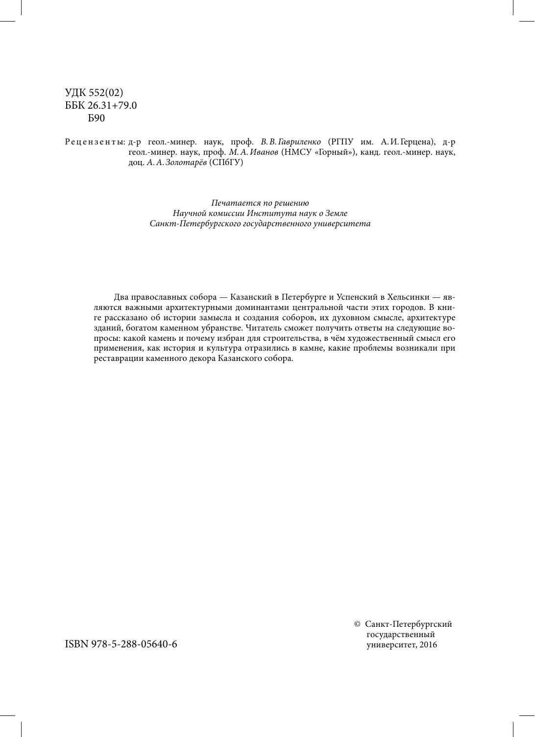 Два православных собора — Казанский в Петербурге и Успенский в Хельсинки — являются важными архитектурными доминантами центральной части этих городов. В книге рассказано об истории замысла и создания соборов, их духовном смысле, архитектуре зданий, богатом каменном убранстве. Читатель сможет получить ответы на следующие вопросы: какой камень и почему избран для строительства, в чём художественный смысл его применения, как история и культура отразились в камне, какие проблемы возникали при реставрации каменного декора Казанского собора. Книга адресована искусствоведам, историкам, реставраторам, геологам, краеведам и студентам соответствующих направлений образования, а также широкому кругу читателей.