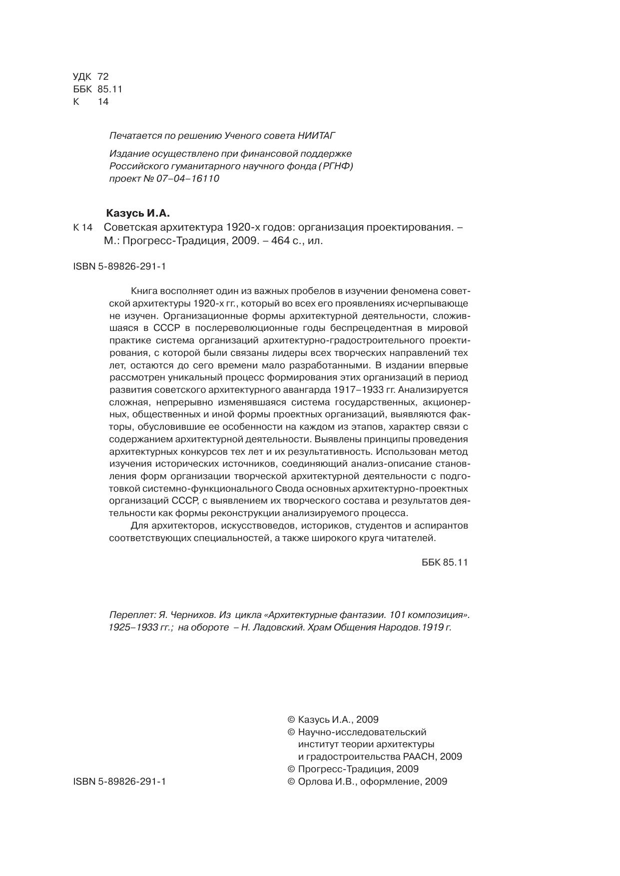 Книга восполняет один из важных пробелов в изучении феномена советской архитектуры 1920-х гг., который во всех его проявлениях исчерпывающе не изучен. Организационные формы архитектурной деятельности, сложившаяся в СССР в послереволюционные годы беспрецедентная в мировой практике система организаций архитектурно-градостроительного проектирования, с которой были связаны лидеры всех творческих направлений тех лет, остаются до сего времени мало разработанными. В издании впервые рассмотрен уникальный процесс формирования этих организаций в период развития советского архитектурного авангарда 1917–1933 гг. Анализируется сложная, непрерывно изменявшаяся система государственных, акционерных, общественных и иной формы проектных организаций, выявляются факторы, обусловившие ее особенности на каждом из этапов, характер связи с содержанием архитектурной деятельности. Выявлены принципы проведения архитектурных конкурсов тех лет и их результативность. Использован метод изучения исторических источников, соединяющий анализ-описание становления форм организации творческой архитектурной деятельности с подготовкой системно-функционального Свода основных архитектурно-проектных организаций СССР, с выявлением их творческого состава и результатов деятельности как формы реконструкции анализируемого процесса.