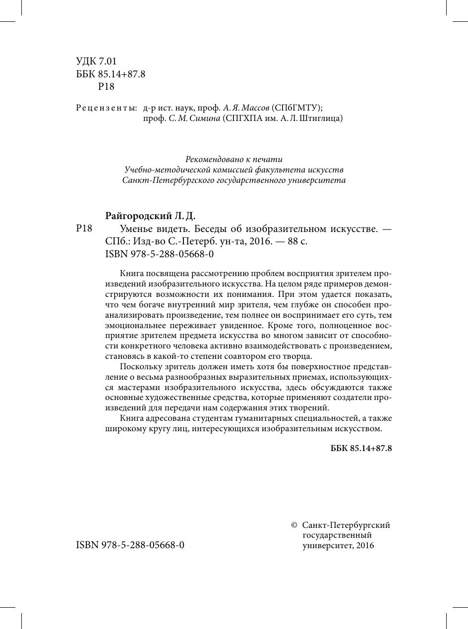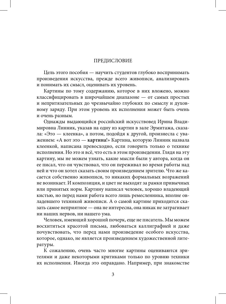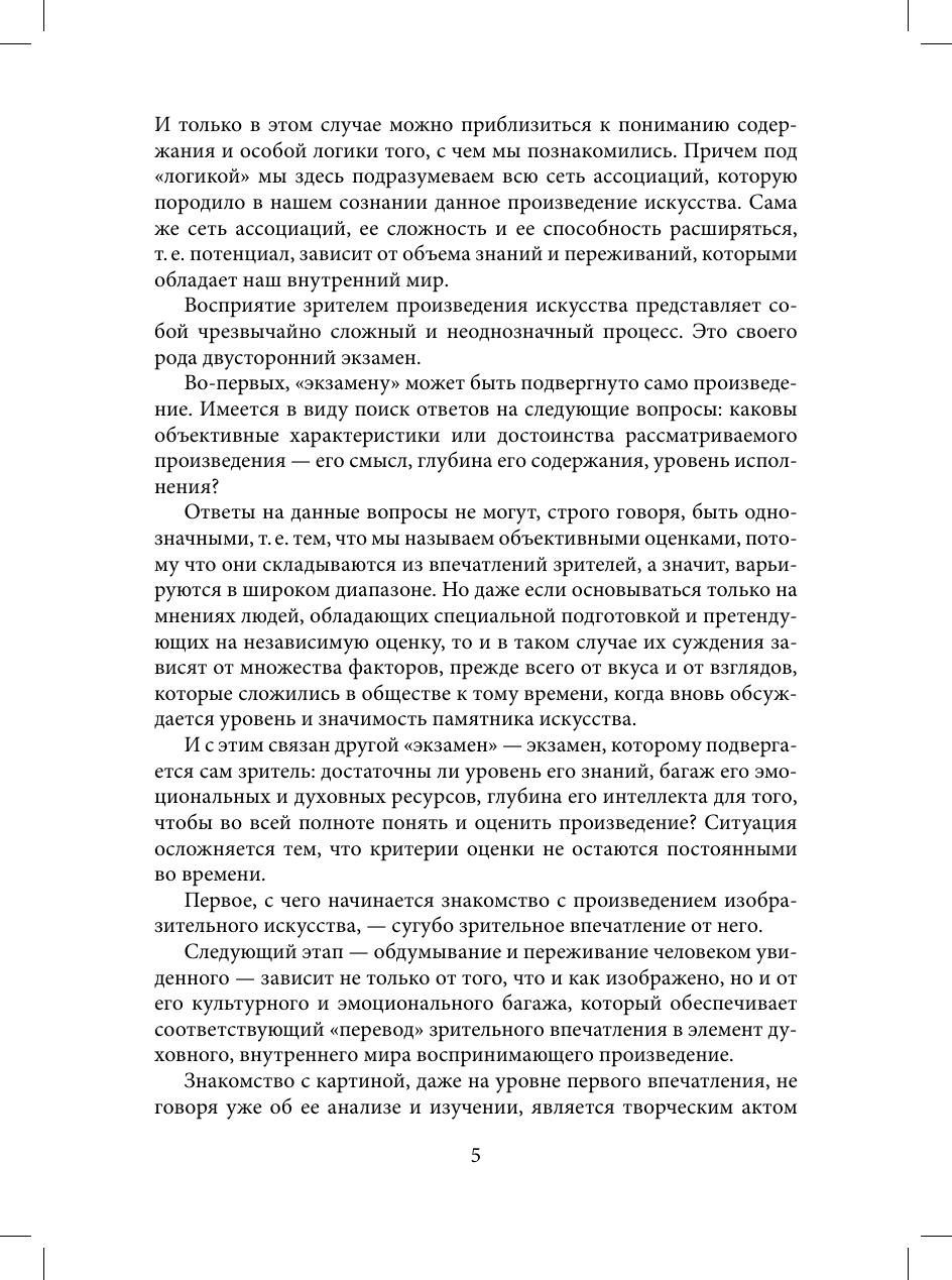 Книга посвящена рассмотрению проблем восприятия зрителем произведений изобразительного искусства. На целом ряде примеров демонстрируются возможности их понимания. При этом удается показать, что чем богаче внутренний мир зрителя, чем глубже он способен проанализировать произведение, тем полнее он воспринимает его суть, тем эмоциональнее переживает увиденное. Кроме того, полноценное восприятие зрителем предмета искусства во многом зависит от способности конкретного человека активно взаимодействовать с произведением, становясь в какой-то степени соавтором его творца.