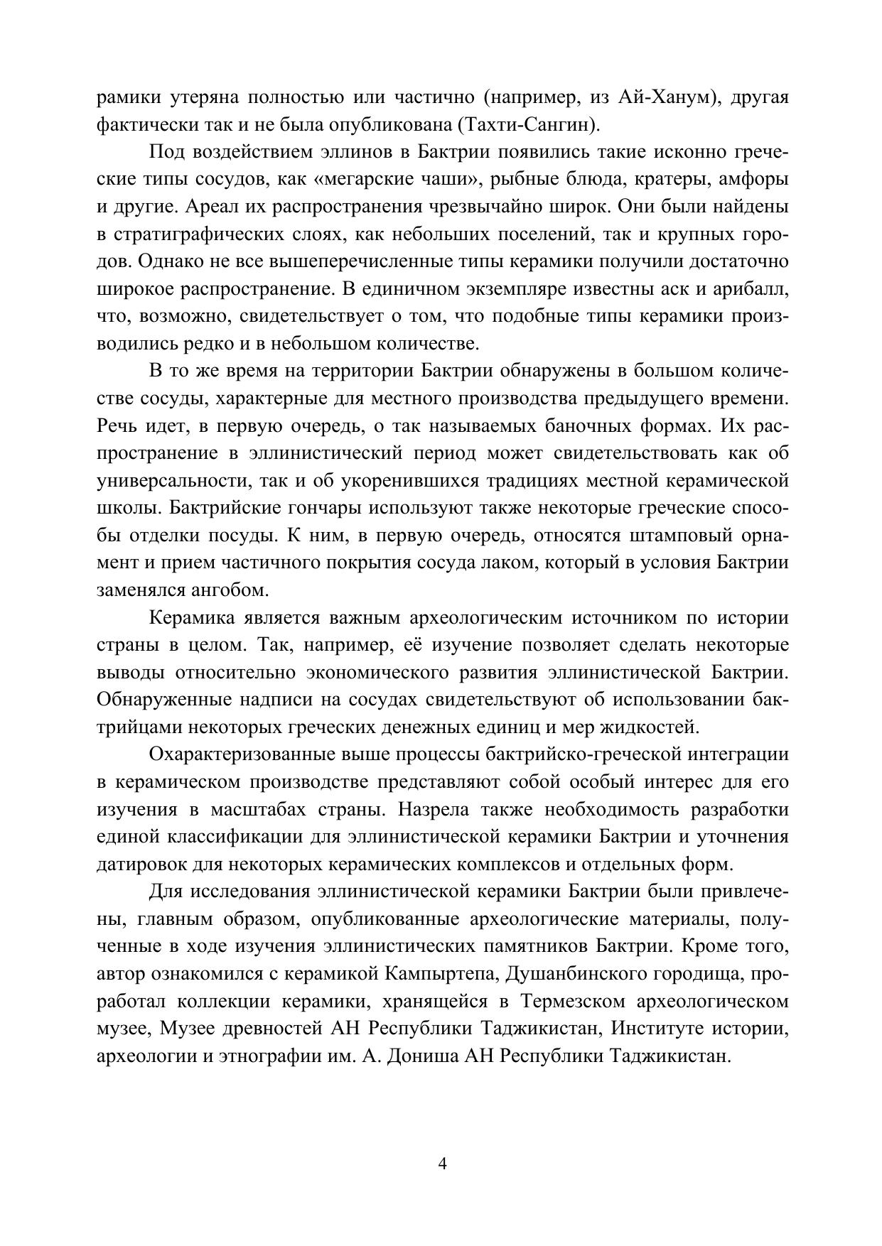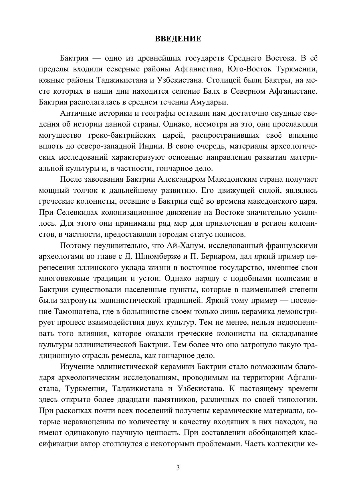Книга посвящена одной из актуальных проблем среднеазиатской археологии – эллинистической керамике Бактрии. В ней рассматриваются такие вопросы, как история изучения, классификация, хронология и эволюция керамических форм, а также выявляются местные традиции и греческие новации в гончарном деле Бактрии эллинистической эпохи.