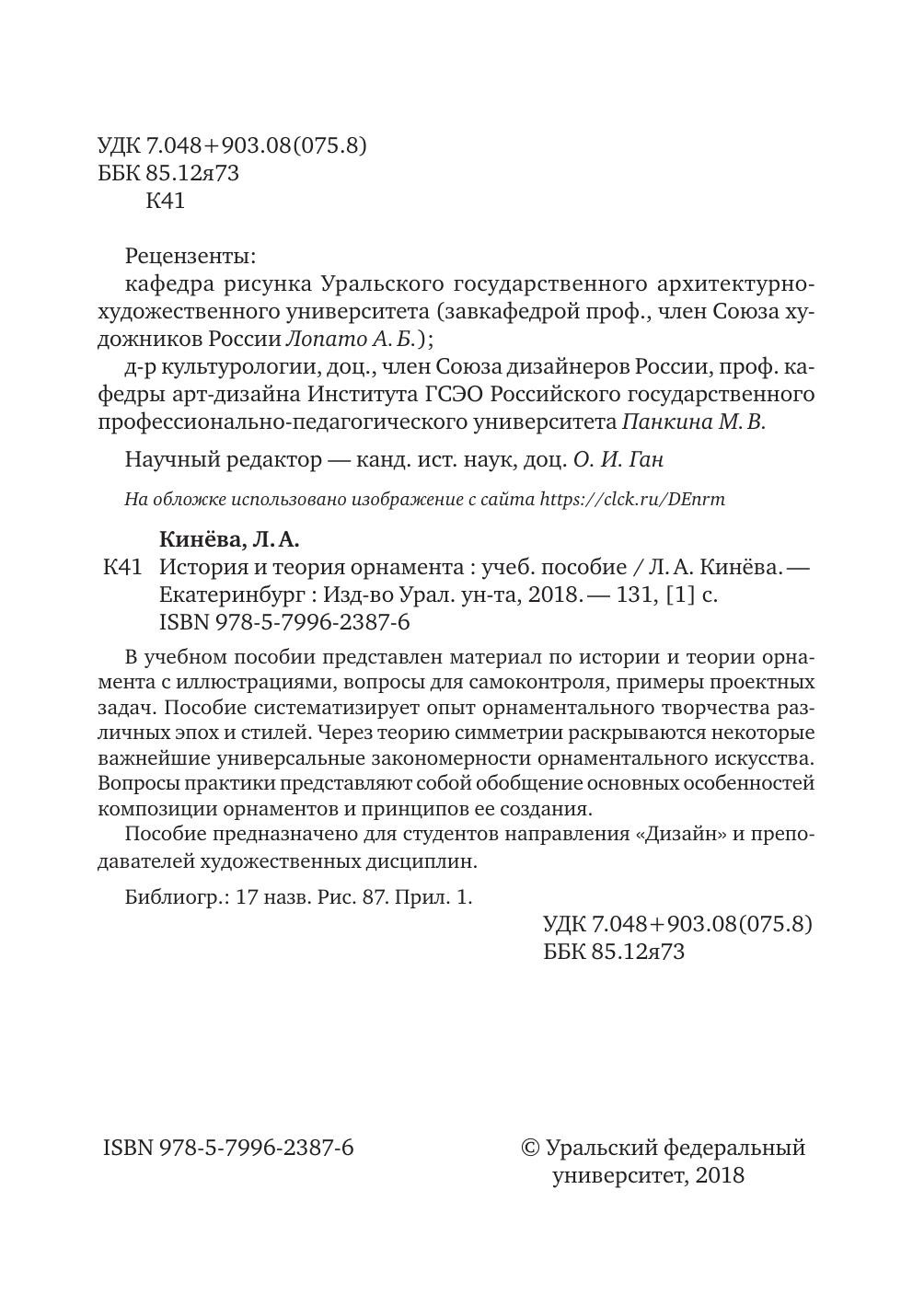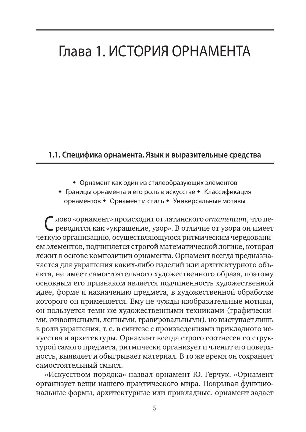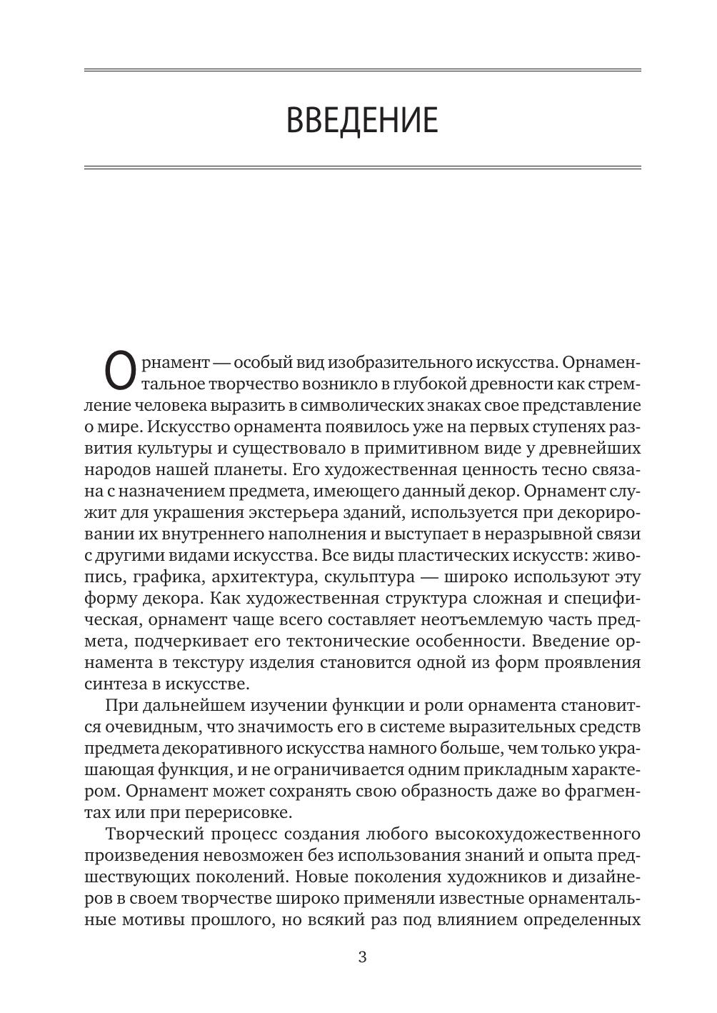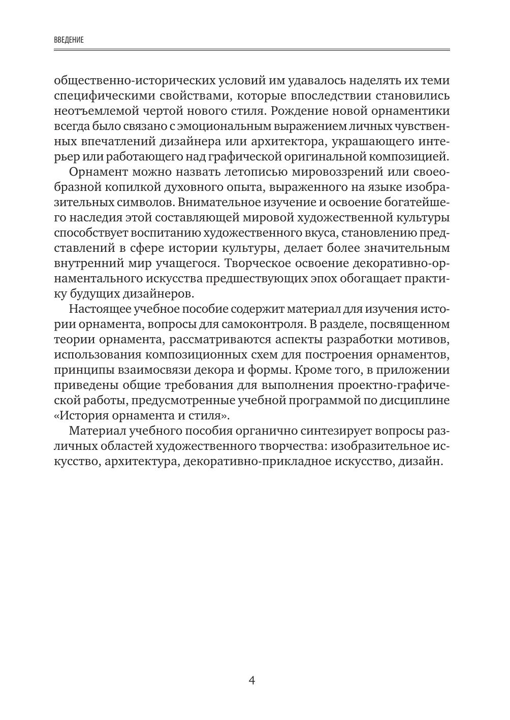 В учебном пособии представлен материал по истории и теории орнамента с иллюстрациями, вопросы для самоконтроля, примеры проектных задач. Пособие систематизирует опыт орнаментального творчества различных эпох и стилей. Через теорию симметрии раскрываются некоторые важнейшие универсальные закономерности орнаментального искусства.