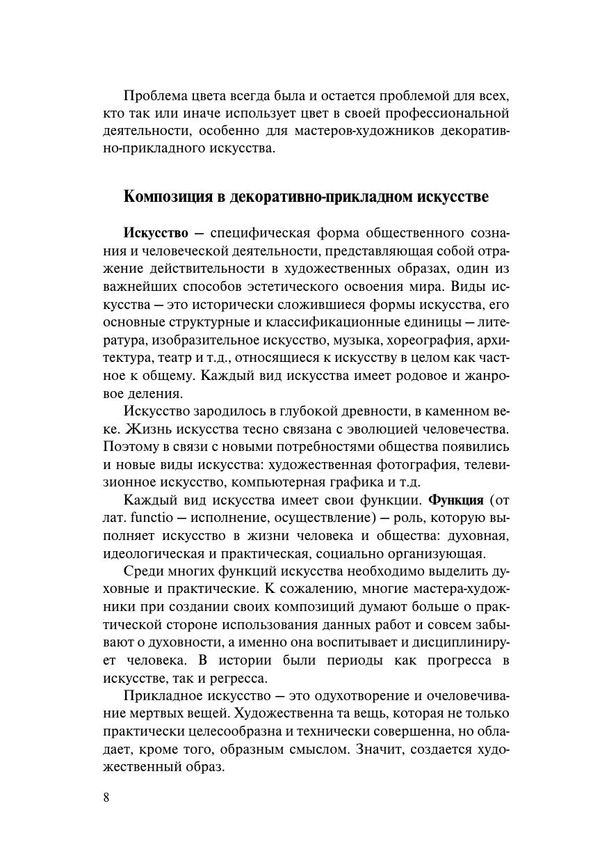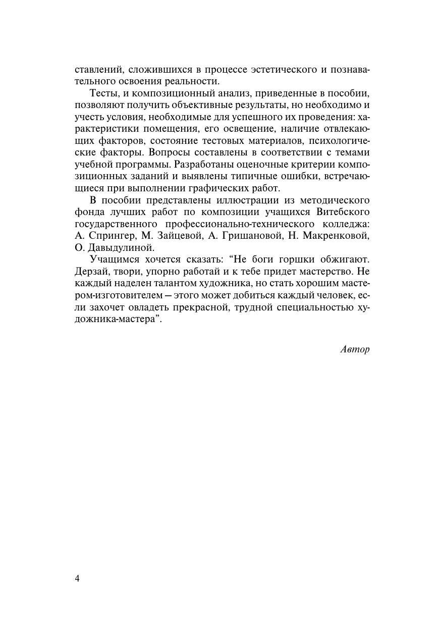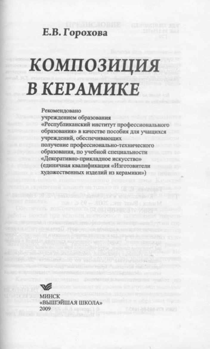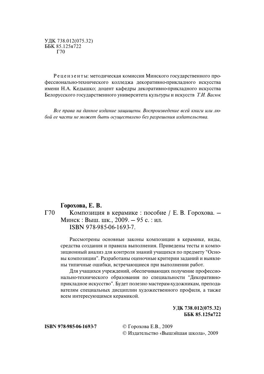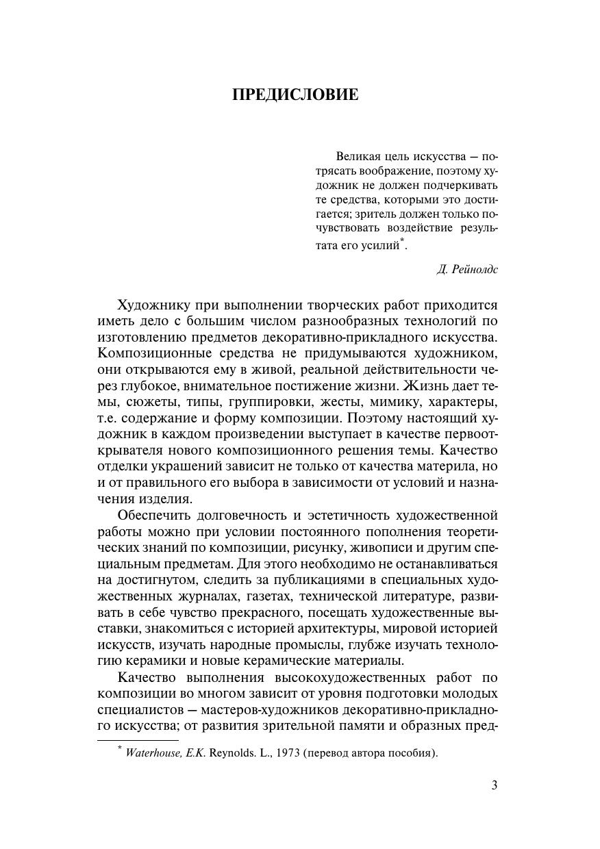 Рассмотрены основные законы композиции в керамике, виды, средства создания и правила выполнения. Приведены тесты и композиционный анализ для контроля знаний учащихся по предмету «Основы композиции». Для учащихся ПТУ по учебной специальности «Декоративно-прикладное искусство».