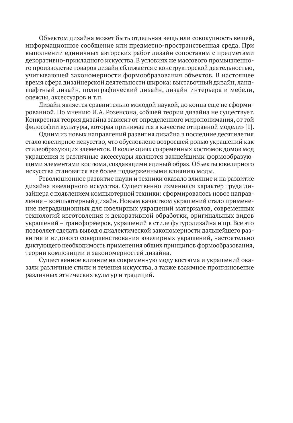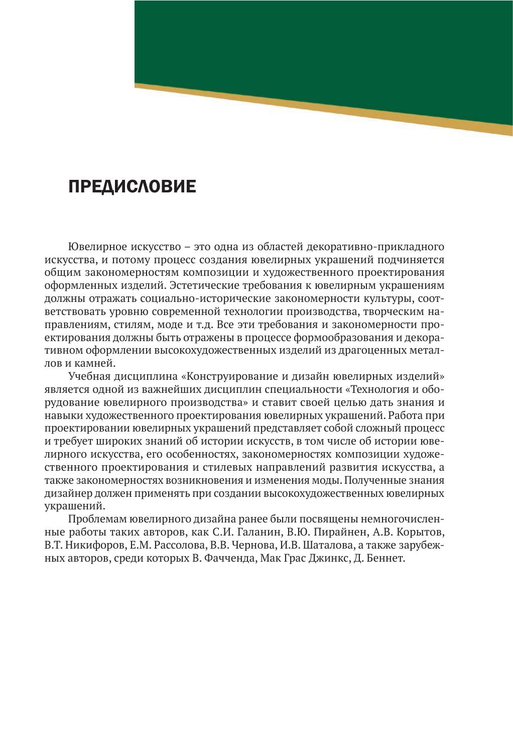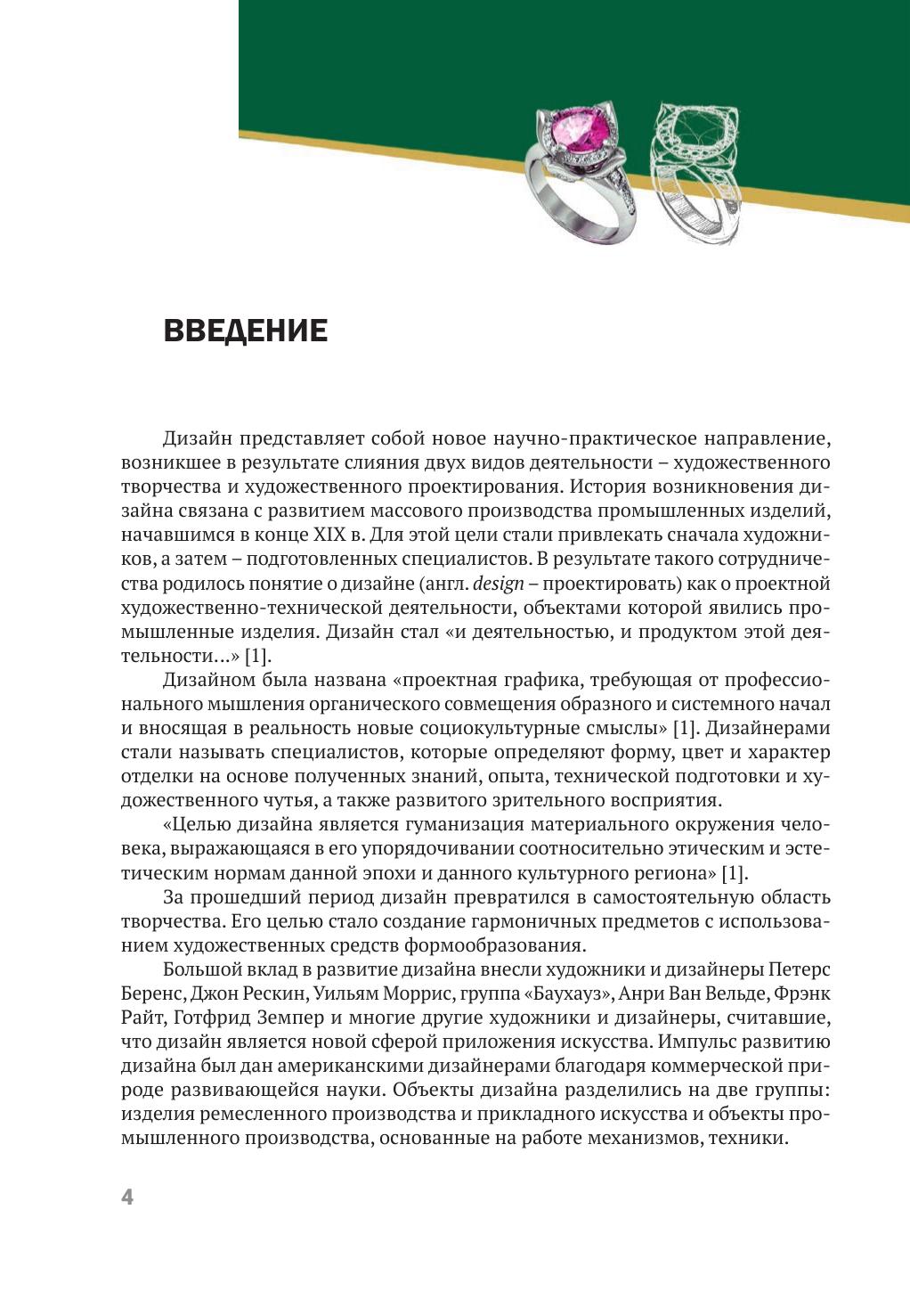 Изложены общие сведения об истории ювелирного искусства и тенденциях развития ювелирного дизайна, освещены основные принципы формообразования изделий на основе теории композиции. Приведены краткая история развития стилей в ювелирном искусстве, закономерности возникновения моды и ее влияние на формирование покупательского спроса на ювелирные товары. Даны классификация ювелирных изделий и рекомендации по проектированию ювелирных украшений с вставками из драгоценных и недрагоценных материалов, декоративному оформлению. Приведены описания основных видов ювелирных изделий и их конструктивные особенности исполнения. Для студентов учреждений высшего образования по специальности «Технология и оборудование ювелирного производства». Будет полезен для студентов, обучающихся по специальностям «Дизайн моды», «Технология художественной обработки материалов», а также широкого круга читателей, интересующихся красотой ювелирных украшений.