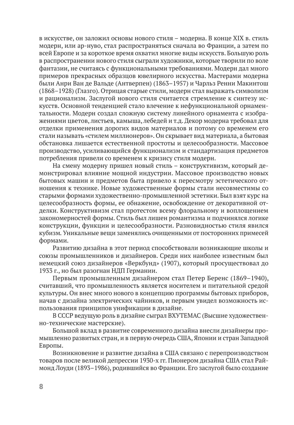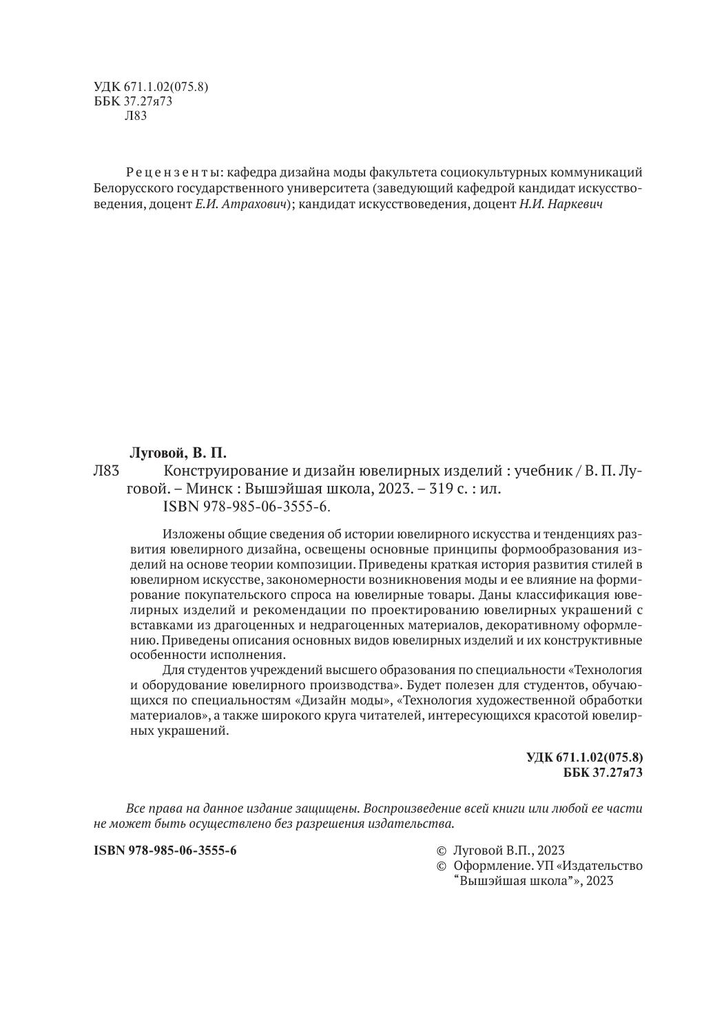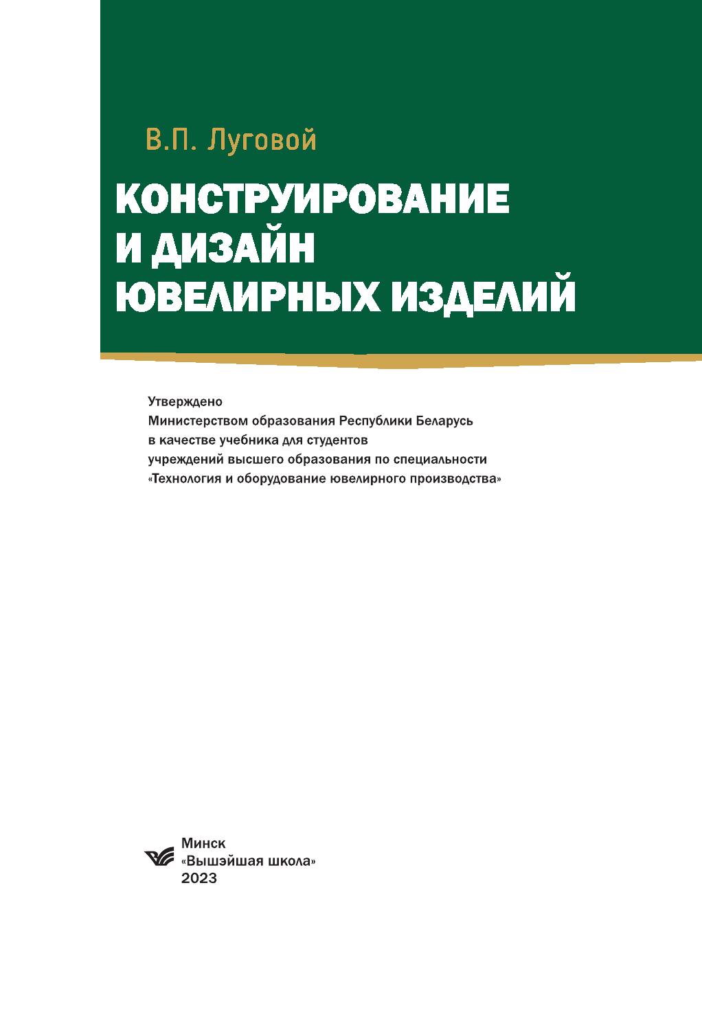 Изложены общие сведения об истории ювелирного искусства и тенденциях развития ювелирного дизайна, освещены основные принципы формообразования изделий на основе теории композиции. Приведены краткая история развития стилей в ювелирном искусстве, закономерности возникновения моды и ее влияние на формирование покупательского спроса на ювелирные товары. Даны классификация ювелирных изделий и рекомендации по проектированию ювелирных украшений с вставками из драгоценных и недрагоценных материалов, декоративному оформлению. Приведены описания основных видов ювелирных изделий и их конструктивные особенности исполнения. Для студентов учреждений высшего образования по специальности «Технология и оборудование ювелирного производства». Будет полезен для студентов, обучающихся по специальностям «Дизайн моды», «Технология художественной обработки материалов», а также широкого круга читателей, интересующихся красотой ювелирных украшений.