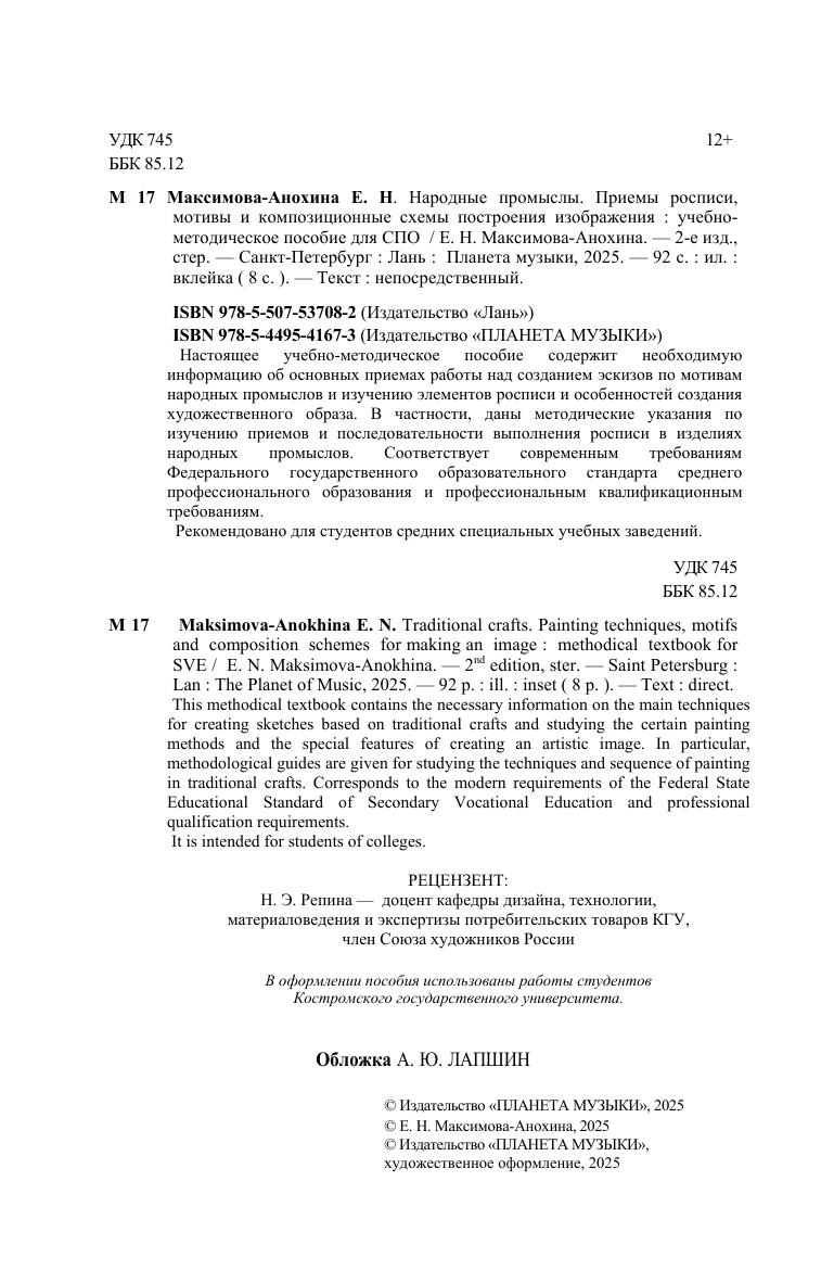 Настоящее учебно-методическое пособие содержит необходимую информацию об основных приемах работы над созданием эскизов по мотивам народных промыслов и изучению элементов росписи и особенностей создания художественного образа. В частности, даны методические указания по изучению приемов и последовательности выполнения росписи в изделиях народных промыслов. Соответствует современным требованиям Федерального государственного образовательного стандарта среднего профессионального образования и профессиональным квалификационным требованиям. Рекомендовано для студентов средних специальных учебных заведений. This methodical textbook contains the necessary information on the main techniques for creating sketches based on traditional crafts and studying the certain painting methods and the special features of creating an artistic image. In particular, methodological guides are given for studying the techniques and sequence of painting in traditional crafts. Corresponds to the modern requirements of the Federal State Educational Standard of Secondary Vocational Education and professional qualification requirements. It is intended for students of colleges.