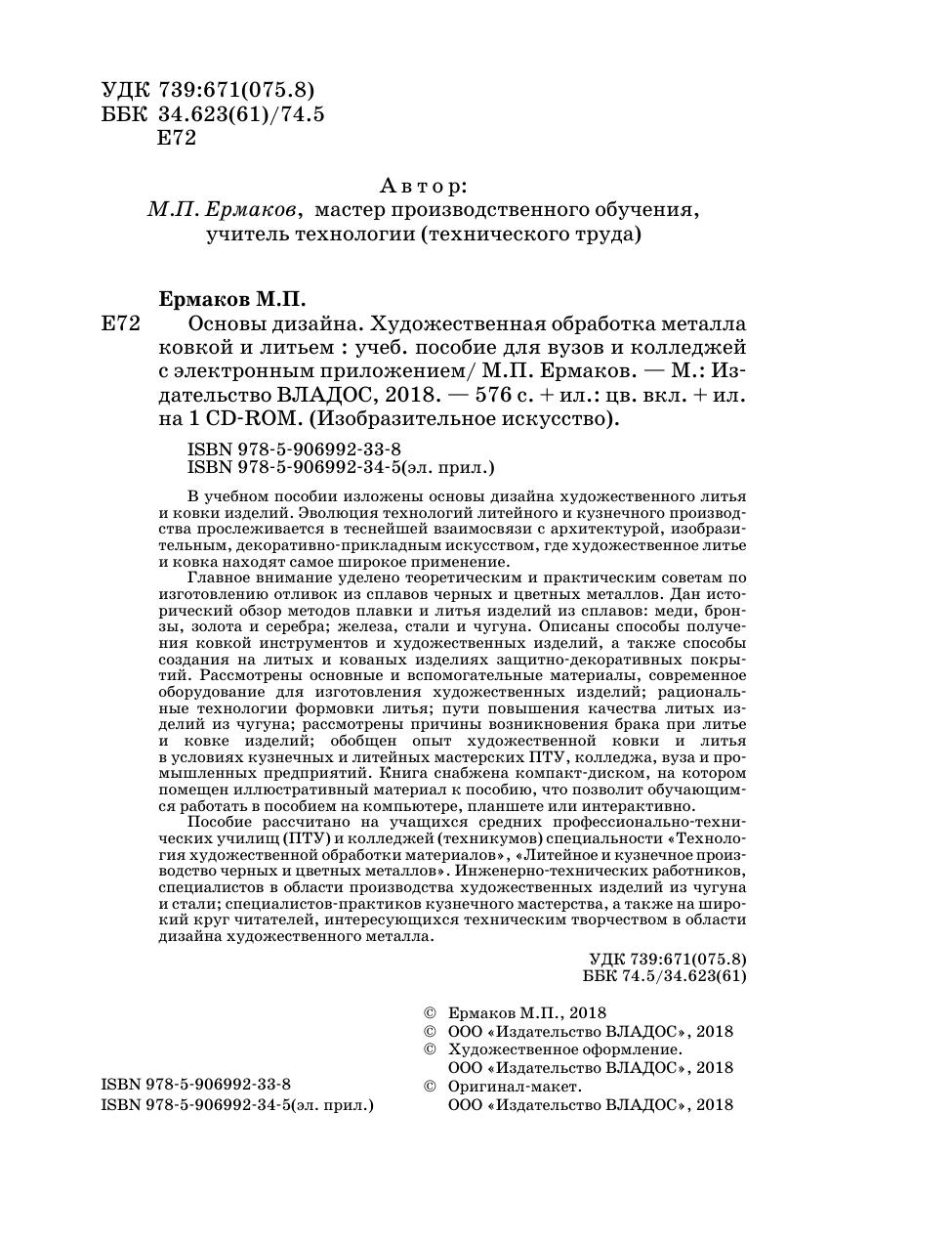 и ковке изделий; обобщен опыт художественной ковки и литья в условиях кузнечных и литейных мастерских ПТУ, колледжа, вуза и промышленных предприятий. Книга снабжена компакт-диском, на котором помещен иллюстративный материал к пособию, что позволит обучающимся работать в пособием на компьютере, планшете или интерактивно.