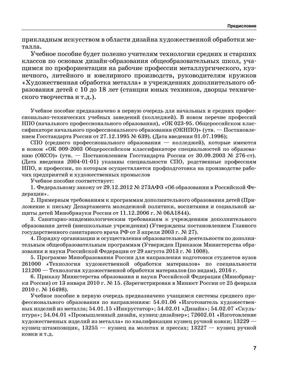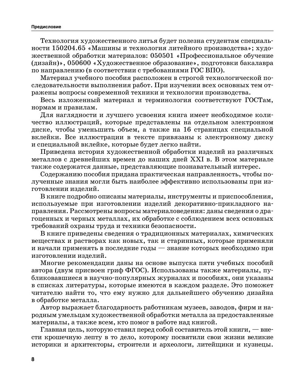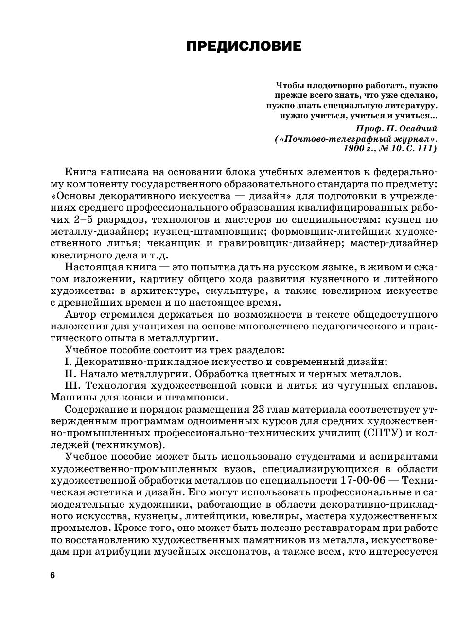 Пособие рассчитано на учащихся средних профессиональ но-тех нических училищ (ПТУ) и колледжей (техникумов) специ альности «Технология художественной обработки материалов», «Литейное и кузнечное производство черных и цветных металлов». Инженерно-технических работников, специалистов в области про изводства художественных изделий из чугуна и стали; специалистов-практиков кузнечного мастерства, а также на широкий круг читателей, интересующихся техническим творчеством в области дизайна художественного металла.