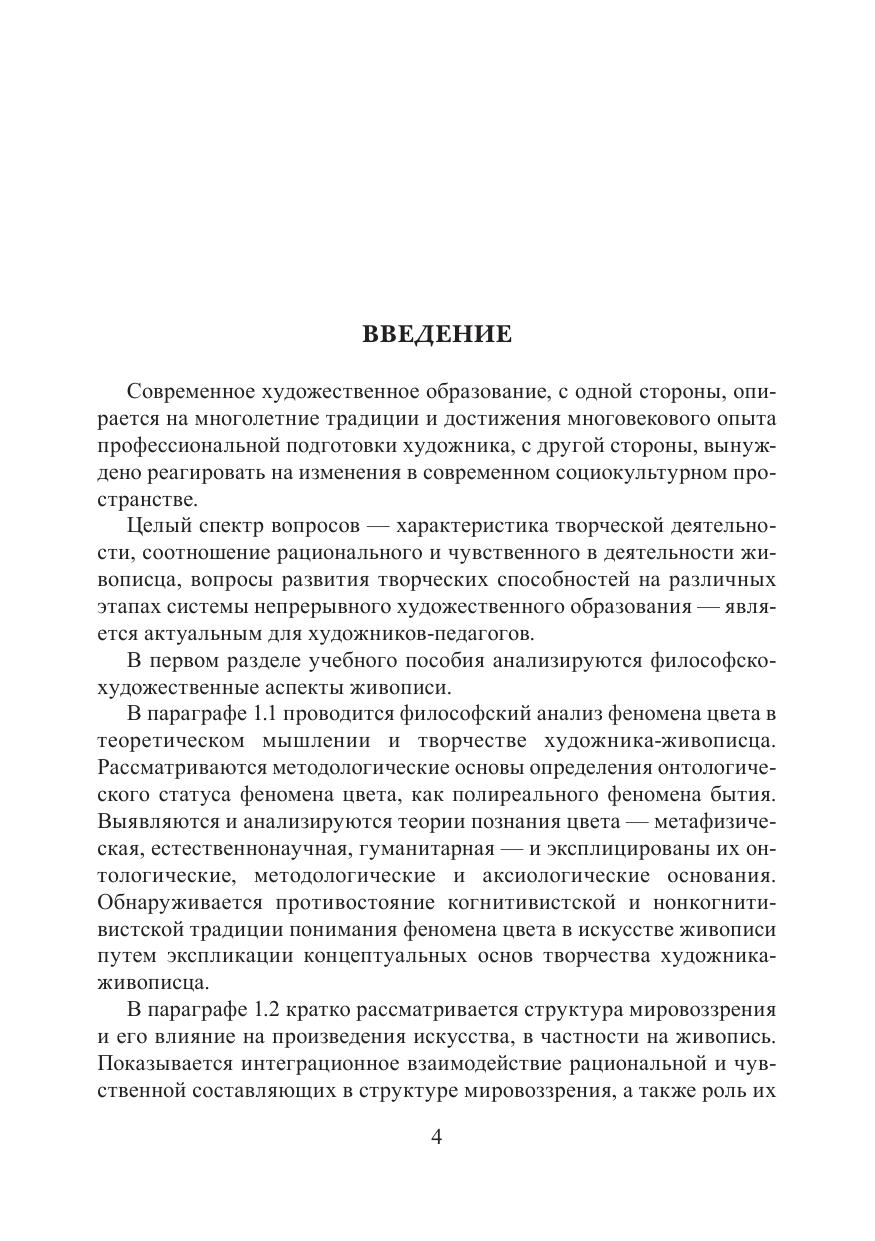 Авторы учебного пособия затрагивают актуальный спектр вопросов — философско-художественные аспекты живописи, характеристика творческой деятельности, соотношение рационального и чувственного в деятельности живописца, вопросы развития творческих способностей на различных этапах системы непрерывного худо жественного образования. Материалы пособия обобщают многолетний научно-исследовательский и педагогический опыт магнитогорской школы высшего профессионального образования в области подготовки художников-педагогов, мастеров декоративно-прикладного искусства и дизайнеров. Пособие проиллюстрировано авторскими живописными работами преподавателей живописи, учебными и творческими работами студентов Института строительства, архитектуры и искусства Магнитогорского государственного технического университета им. Г.И. Носова, детскими рисунками и эскизами дидактических пособий к занятиям.