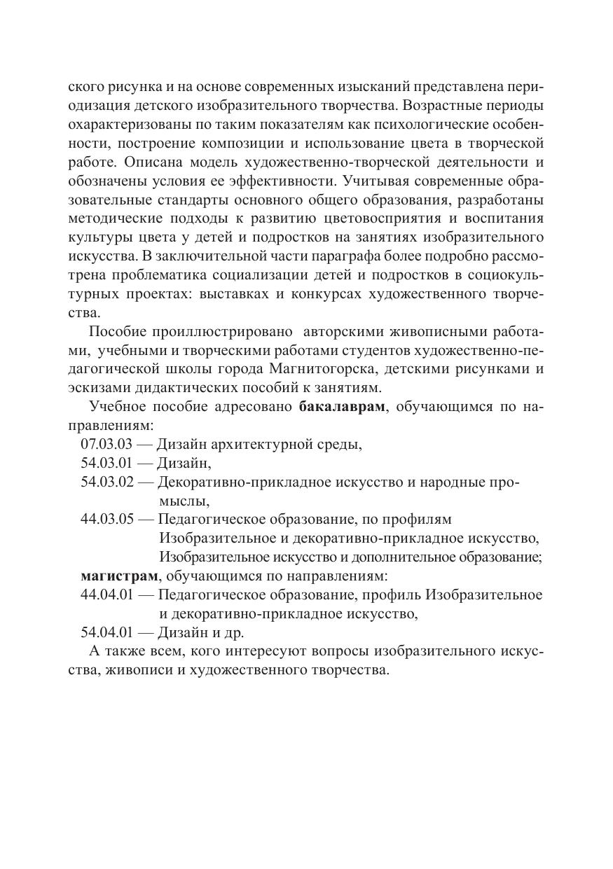 Учебное пособие адресовано бакалаврам по направлениям 07.03.03 — Дизайн архитектурной среды, 54.03.01 — Дизайн, 54.03.02 — Декоративно-прикладное искусство и народные промыслы, 44.03.05 — Педагогическое образование, по профилям — Изобразительное и декоративно-прикладное искусство, Изобразительное искусство и дополнительное образование; магистрам, обучающимся по направлениям 44.04.01 — Педагогическое образование, профиль Изобразительное и декоративноприкладное искусство, 54.04.01 — Дизайн и др. А также всем, кого интересуют вопросы изобразительного искусства, живописи и художественного творчества.