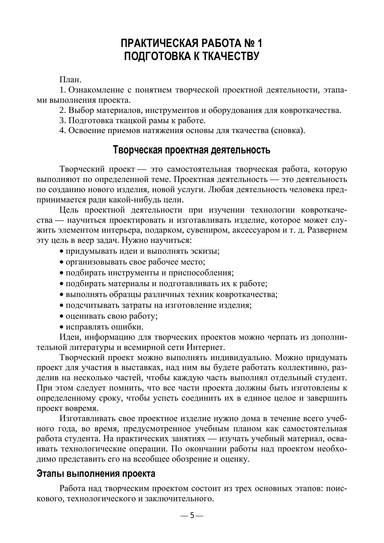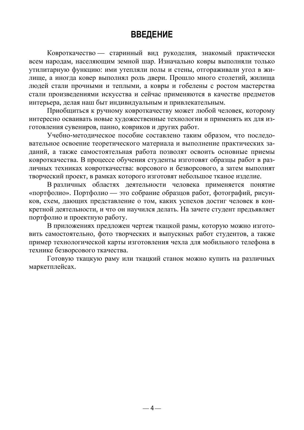 В пособии даются методические рекомендации по содержанию, структуре, а также последовательности выполнения практических работ по ковроткачеству, созданию портфолио и выполнению творческого проекта в качестве зачетной или выпускной квалификационной работы. Теоретический и графический материал к практическим занятиям и специально разработанные задания помогут студентам освоить этот вид декоративно-прикладного искусства. Соответствует современным требованиям Федерального государственного образовательного стандарта среднего профессионального образования и профессиональным и квалификационным требованиям. Предназначено для студентов техникумов и колледжей, обучающихся по специальности «Декоративно-прикладное искусство и народные промыслы (по видам)».