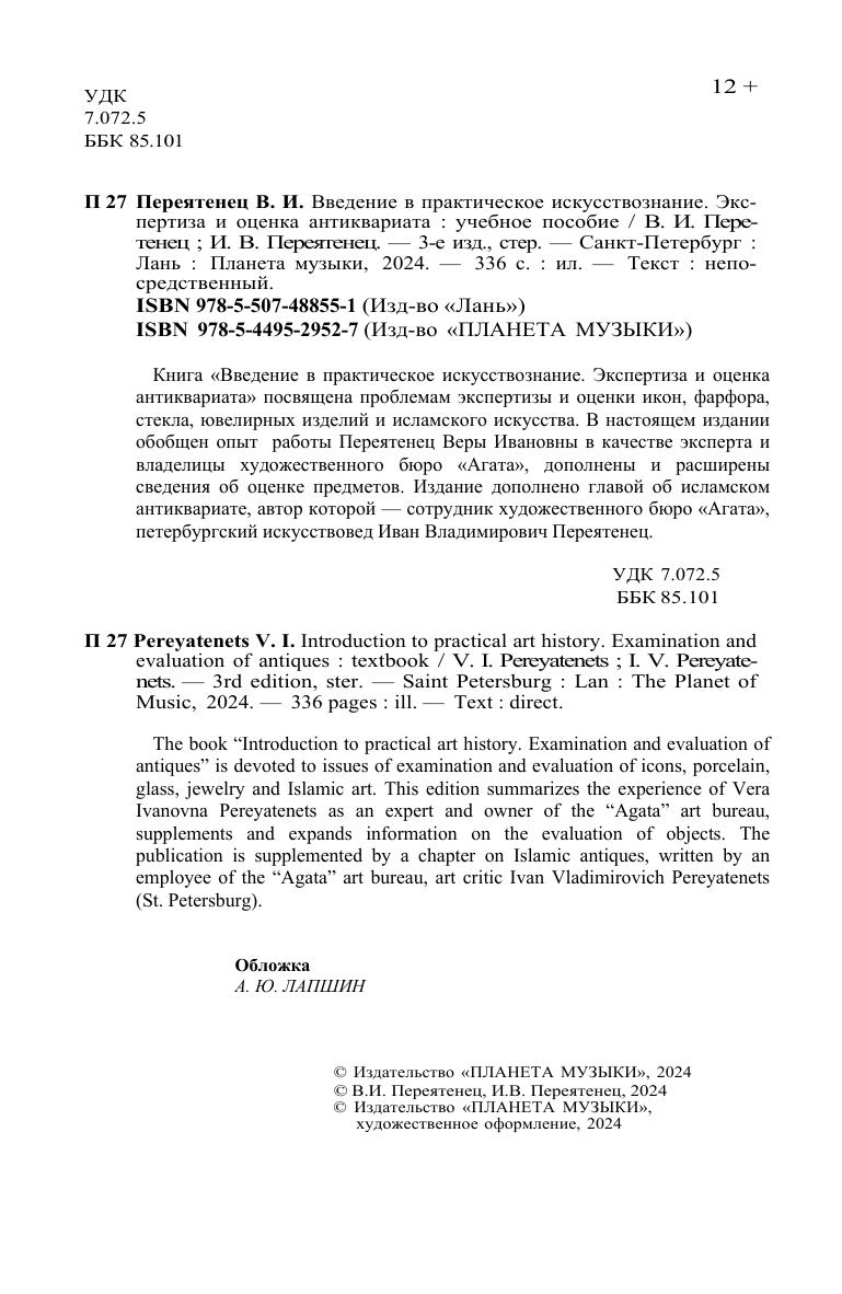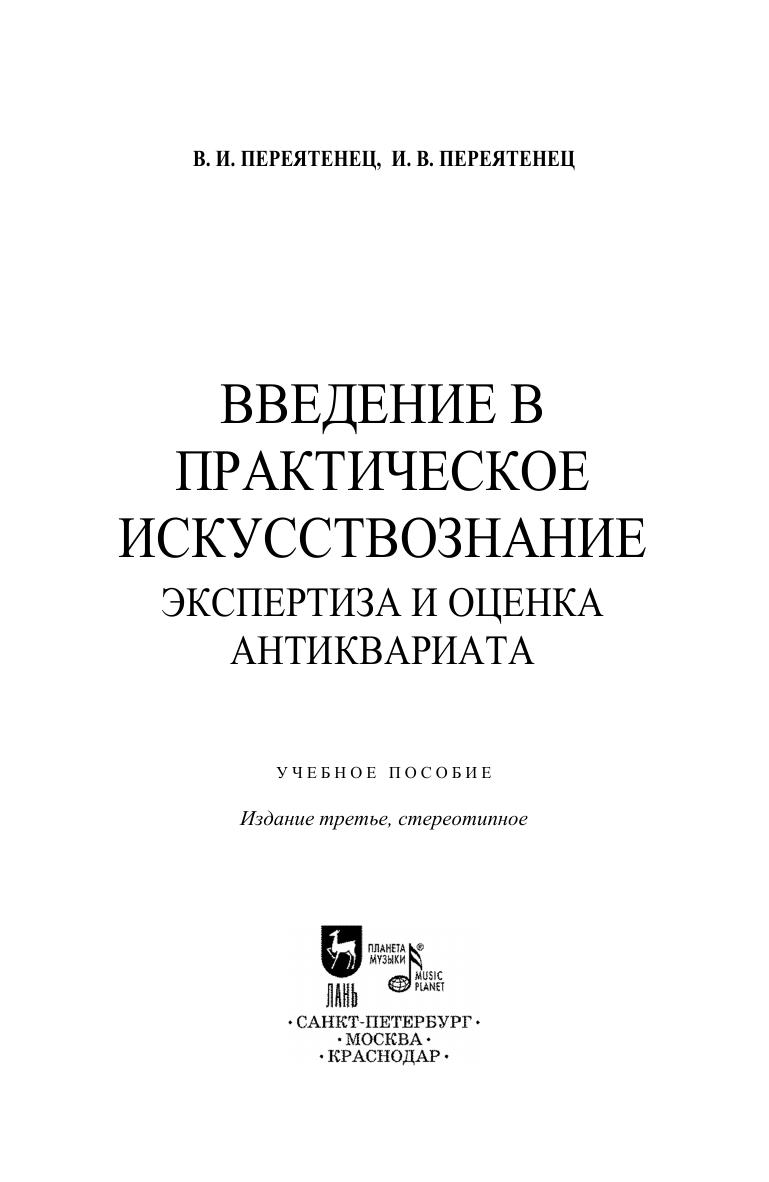 Книга «Введение в практическое искусствознание. Экспертиза и оценка антиквариата» посвящена проблемам экспертизы и оценки икон, фарфора, стекла, ювелирных изделий и исламского искусства. В настоящем издании обобщен опыт работы Переятенец Веры Ивановны в качестве эксперта и владелицы художественного бюро «Агата», дополнены и расширены сведения об оценке предметов. Издание дополнено главой об исламском антиквариате, автор которой — сотрудник художественного бюро «Агата», петербургский искусствовед Иван Владимирович Переятенец.