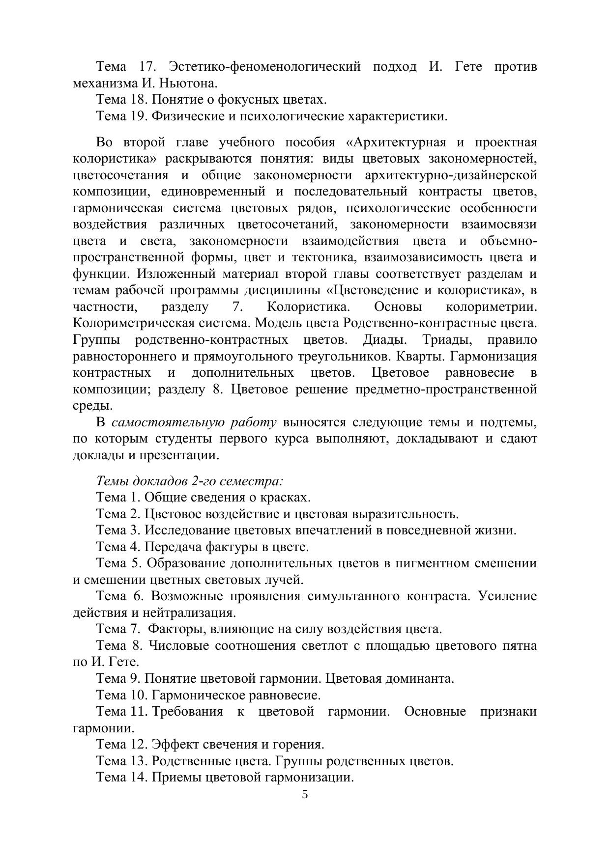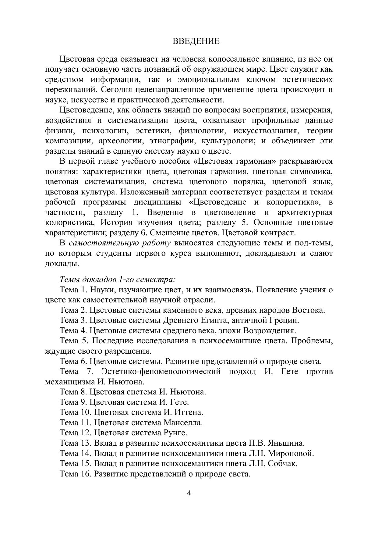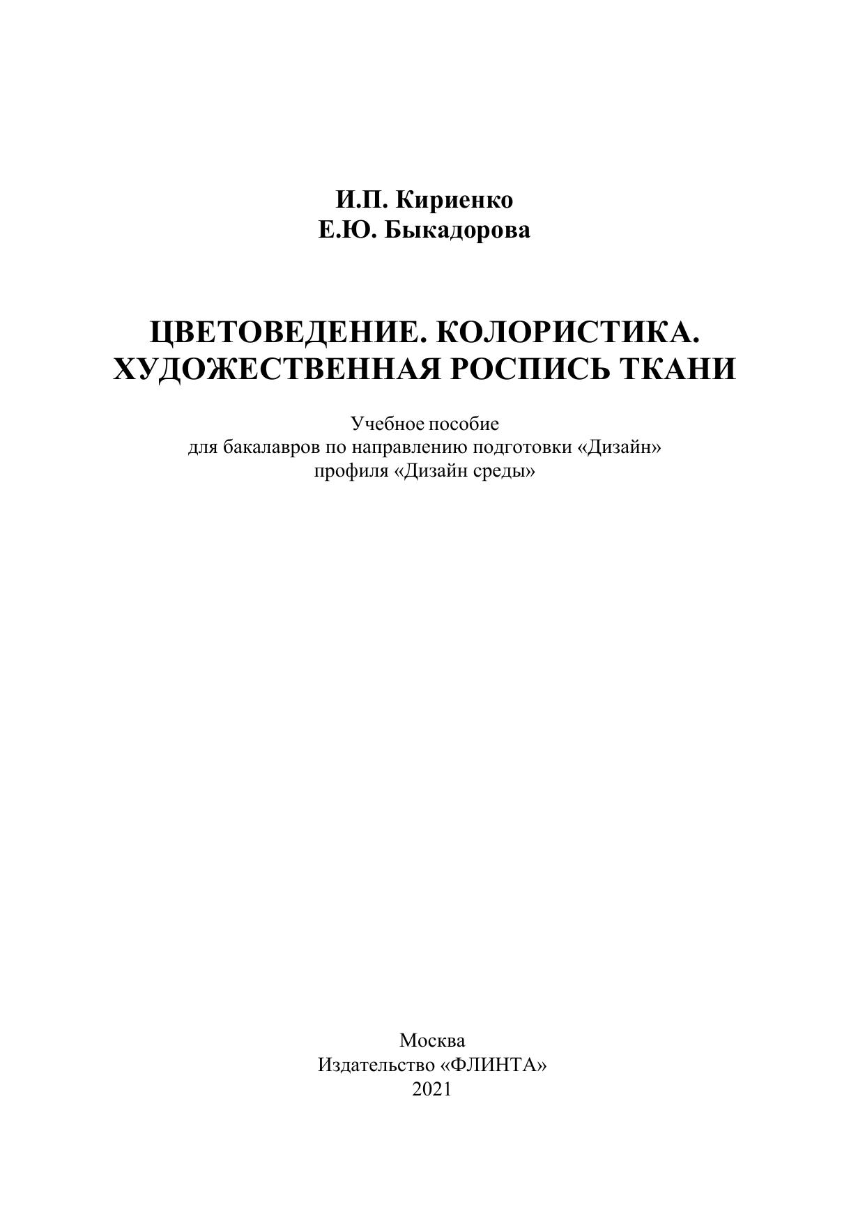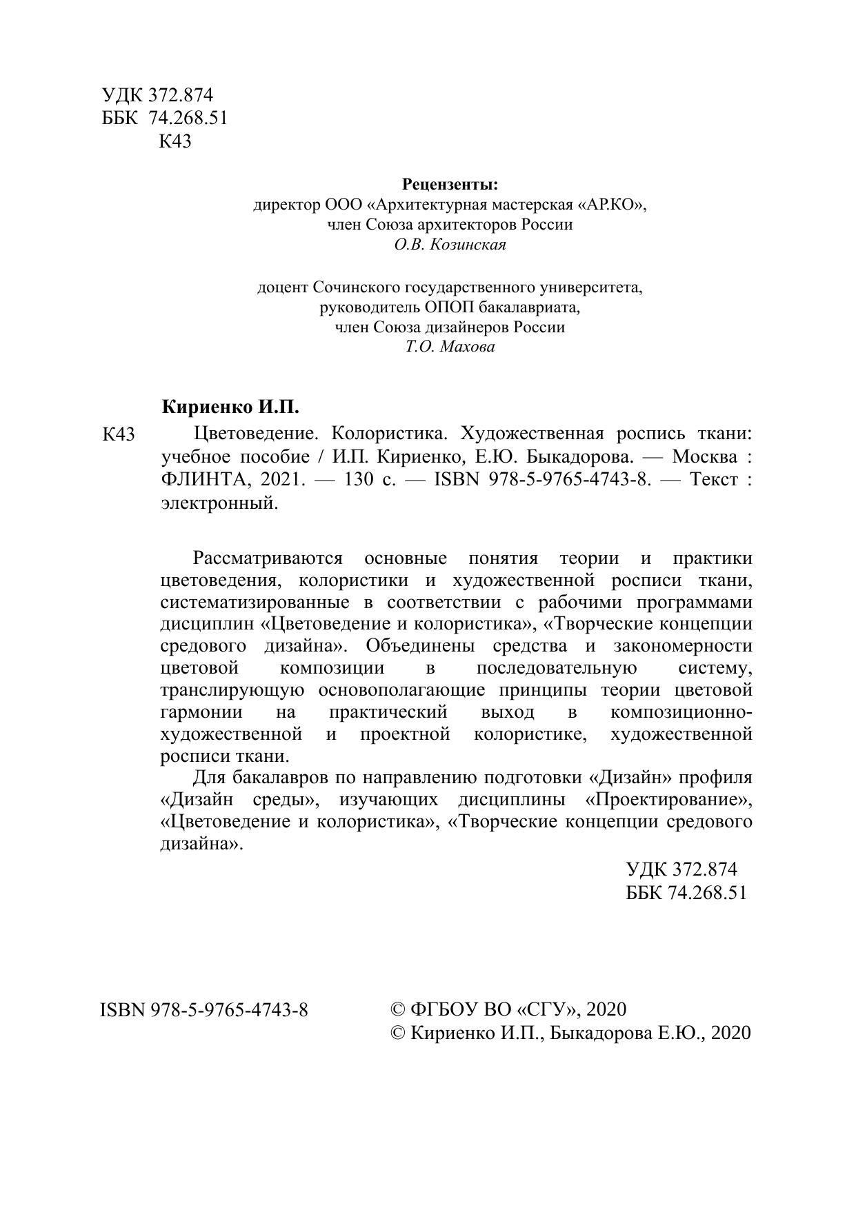 Рассматриваются основные понятия теории и практики цветоведения, колористики и художественной росписи ткани, систематизированные в соответствии с рабочими программами дисциплин «Цветоведение и колористика», «Творческие концепции средового дизайна». Объединены средства и закономерности цветовой композиции в последовательную систему, транслирующую основополагающие принципы теории цветовой гармонии на практический выход в композиционно-художественной и проектной колористике, художественной росписи ткани.