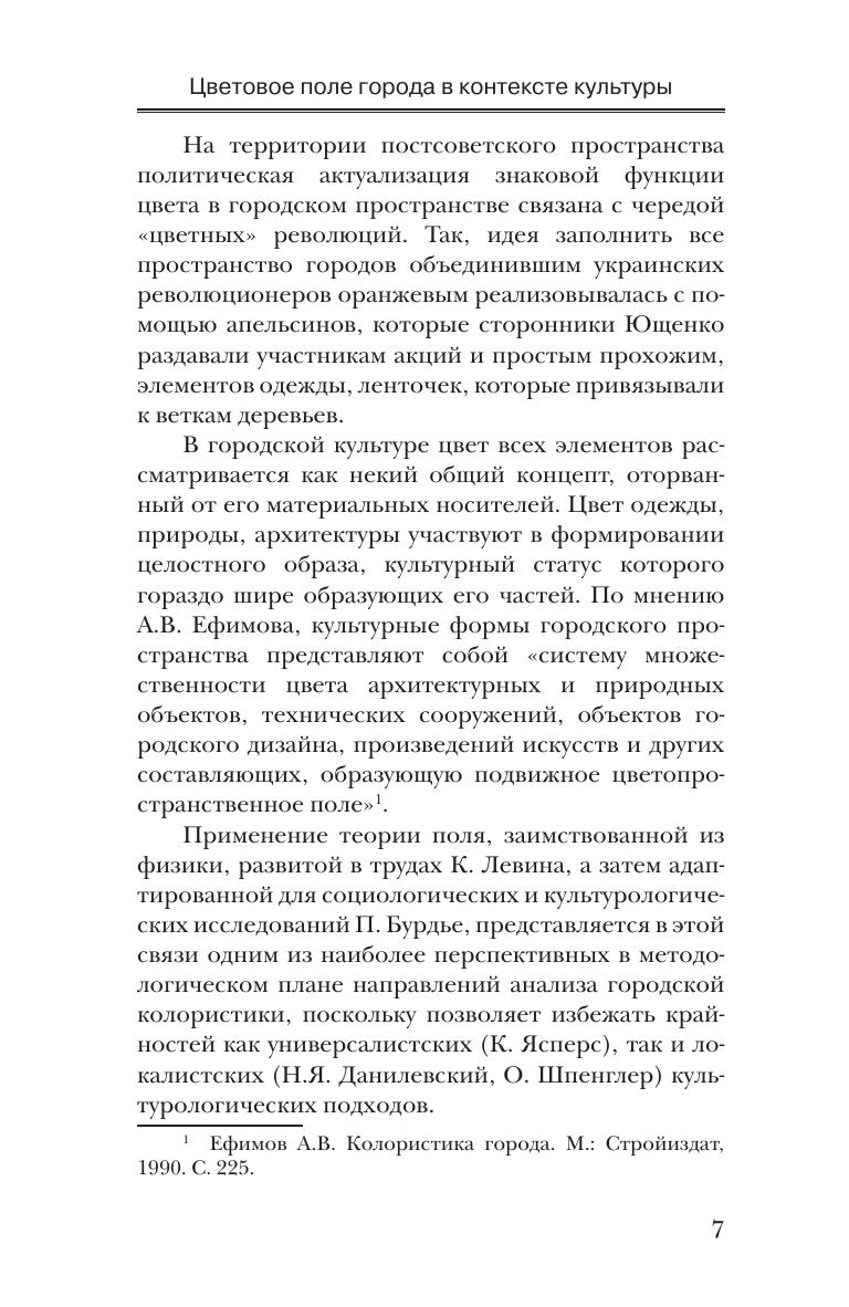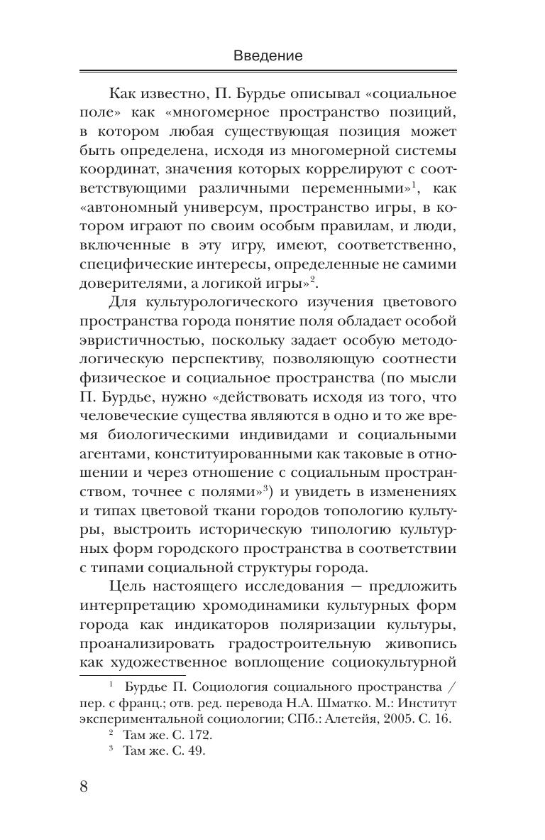 Понятие поля становится концептуальной призмой, позволяющей наблюдать городскую жизнь как часть большой социокультурной системы. Таким способом восстанавливается хронология происхождения цветовых образов городского пространства, анализируется их развитие, механизмы темпоральности и устаревания.