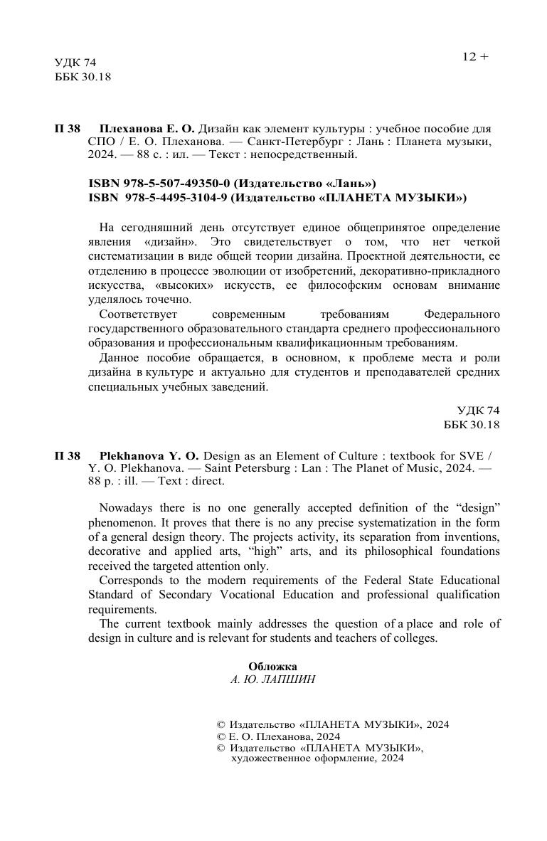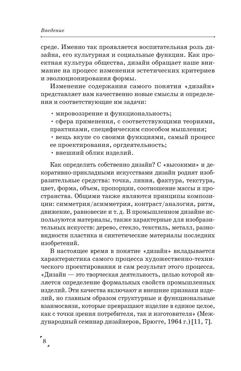 На сегодняшний день отсутствует единое общепринятое определение явления «дизайн». Это свидетельствует о том, что нет четкой систематизации в виде общей теории дизайна. Проектной деятельности, ее отделению в процессе эволюции от изобретений, декоративно-прикладного искусства, «высоких» искусств, ее философским основам внимание уделялось точечно. Соответствует современным требованиям Федерального государственного образовательного стандарта среднего профессионального образования и профессиональным квалификационным требованиям. Данное пособие обращается, в основном, к проблеме места и роли дизайна в культуре и актуально для студентов и преподавателей средних специальных учебных заведений. Nowadays there is no one generally accepted definition of the “design” phenomenon. It proves that there is no any precise systematization in the form of a general design theory. The projects activity, its separation from inventions, decorative and applied arts, “high” arts, and its philosophical foundations received the targeted attention only. Corresponds to the modern requirements of the Federal State Educational Standard of Secondary Vocational Education and professional qualification requirements. The current textbook mainly addresses the question of a place and role of design in culture and is relevant for students and teachers of colleges.