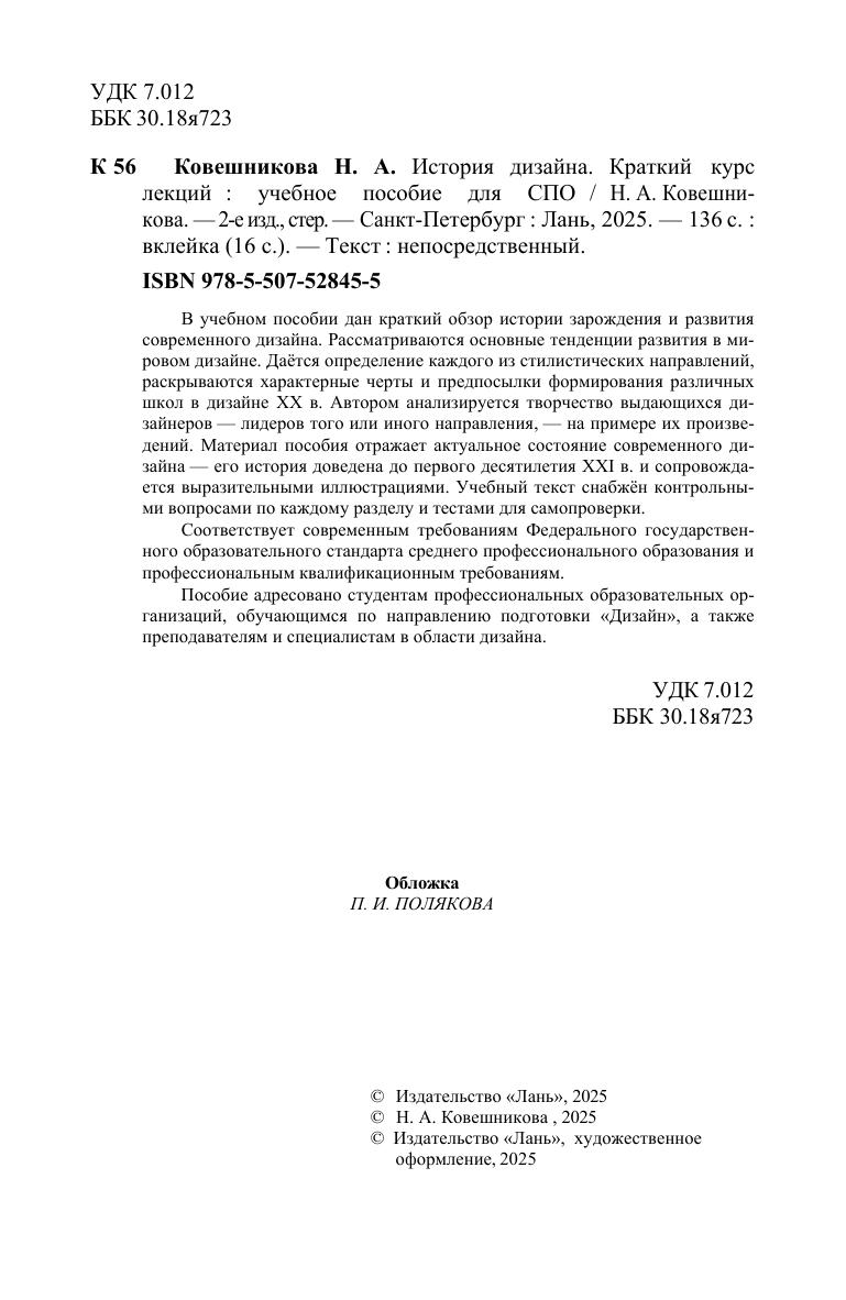 В учебном пособии дан краткий обзор истории зарождения и разви-тия современного дизайна. Рассматриваются основные тенденции разви-тия в мировом дизайне. Даётся определение каждого из стилистических направлений, раскрываются характерные черты и предпосылки форми-рования различных школ в дизайне ХХ в. Автором анализируется твор-чество выдающихся дизайнеров — лидеров того или иного направле-ния, — на примере их произведений. Материал пособия отражает акту-альное состояние современного дизайна — его история доведена до первого десятилетия XXI в. и сопровождается выразительными иллю-страциями. Учебный текст снабжён контрольными вопросами по каждо-му разделу и тестами для самопроверки. Соответствует современным требованиям Федерального государ-ственного образовательного стандарта среднего профессионального образования и профессиональным квалификационным требованиям. Пособие адресовано студентам профессиональных образователь-ных организаций, обучающимся по направлению подготовки «Дизайн», а также преподавателям и специалистам в области дизайна.