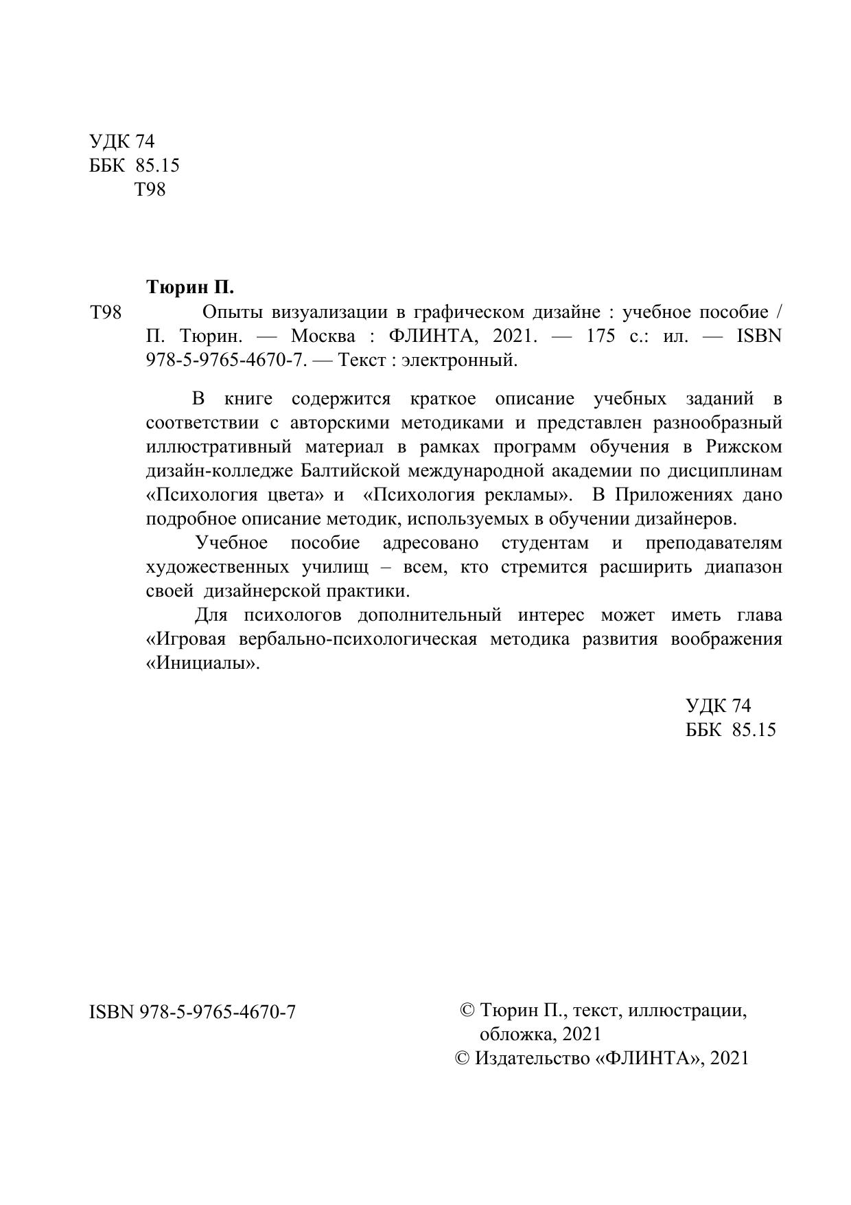 В книге содержится краткое описание учебных заданий в соответствии с авторскими методиками и представлен разнообразный иллюстративный материал в рамках программ обучения в Рижском дизайн-колледже Балтийской международной академии по дисциплинам «Психология цвета» и «Психология рекламы». В Приложениях дано подробное описание методик, используемых в обучении дизайнеров.