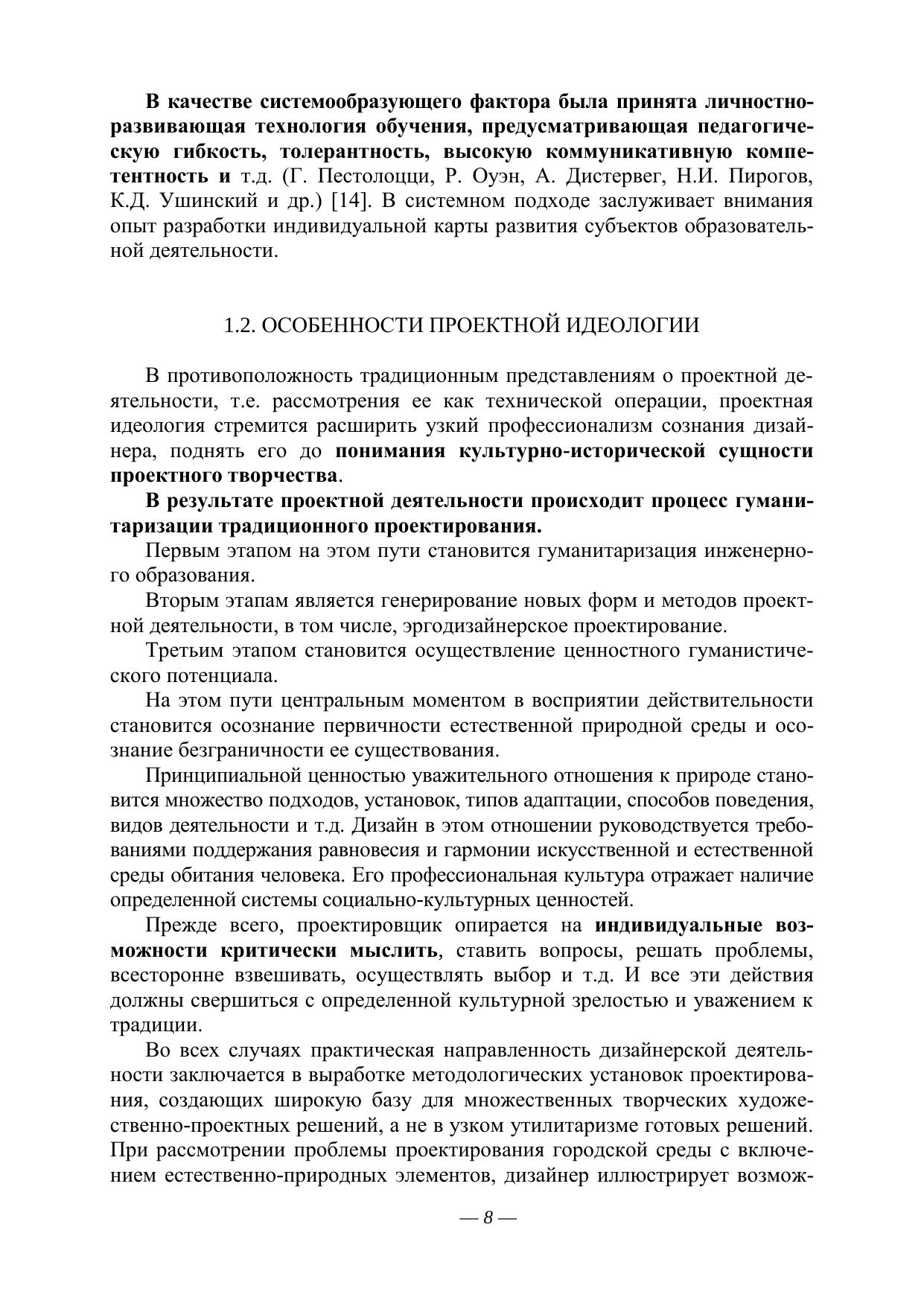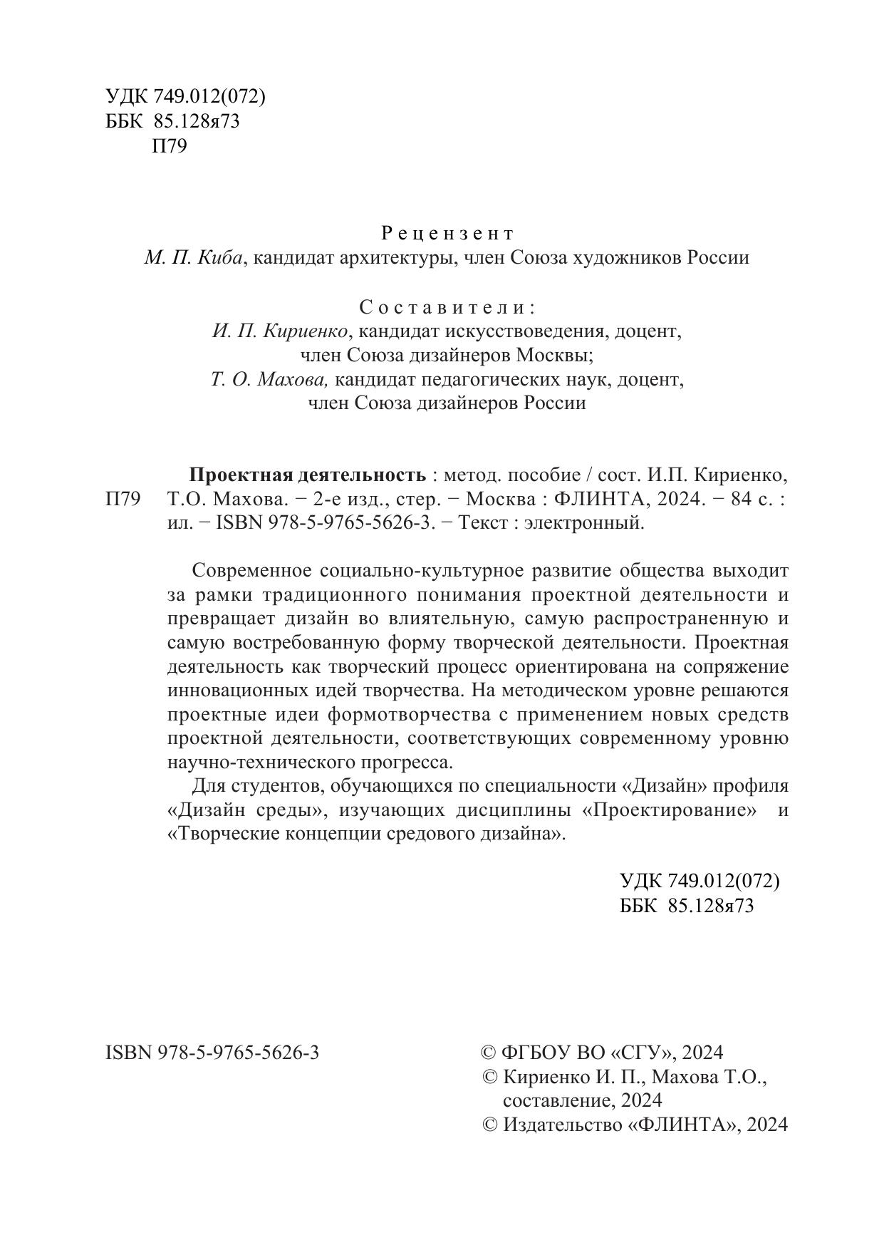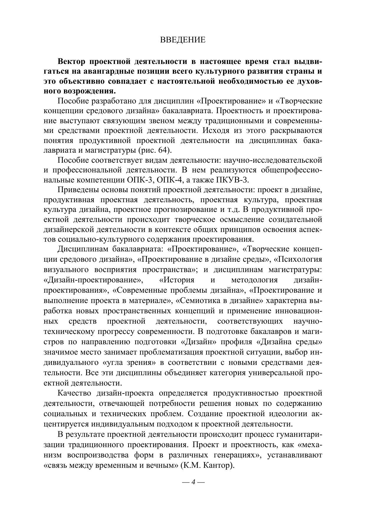 Современное социально-культурное развитие общества выходит за рамки традиционного понимания проектной деятельности и превращает дизайн во влиятельную, самую распространенную и самую востребованную форму творческой деятельности. Проектная деятельность как творческий процесс ориентирована на сопряжение инновационных идей творчества. На методическом уровне решаются проектные идеи формотворчества с применением новых средств проектной деятельности, соответствующих современному уровню научно-технического прогресса. Для студентов, обучающихся по специальности «Дизайн» профиля «Дизайн среды», изучающих дисциплины «Проектирование» и «Творческие концепции средового дизайна».