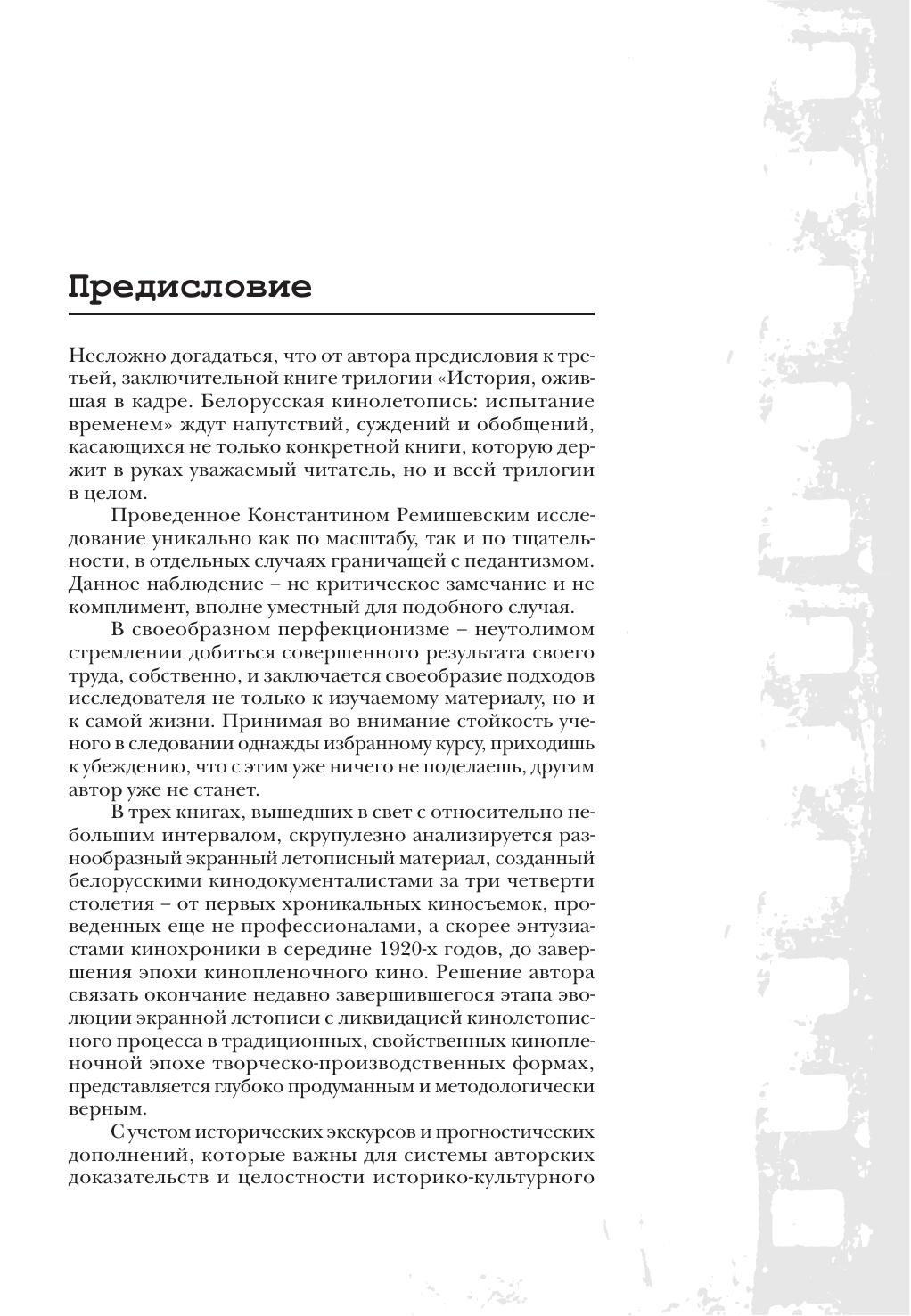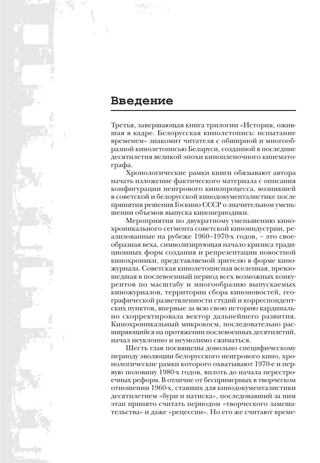 Третья, заключительная книга трилогии знакомит читателя с обширной и многообразной кинолетописью Беларуси, созданной в последние десятилетия эпохи кинопленочного кинематографа. Рассматриваются источники пополнения массива национальной кинолетописи в условиях перехода к цифровым медиа, анализируется принципиальная возможность создания исторически достоверного экранного образа современной Беларуси в постпленочную эпоху. Электронное приложение позволит читателю ознакомиться с тематическим и жанрово-стилевым диапазоном неигровых лент и сюжетов кинопериодики, разнообразными творческими подходами к представлению повседневной жизни людей на документальном экране 1970–2000-х годов. Для специалистов сферы экранных искусств, искусствоведов, культурологов, историков, а также широкого круга читателей.